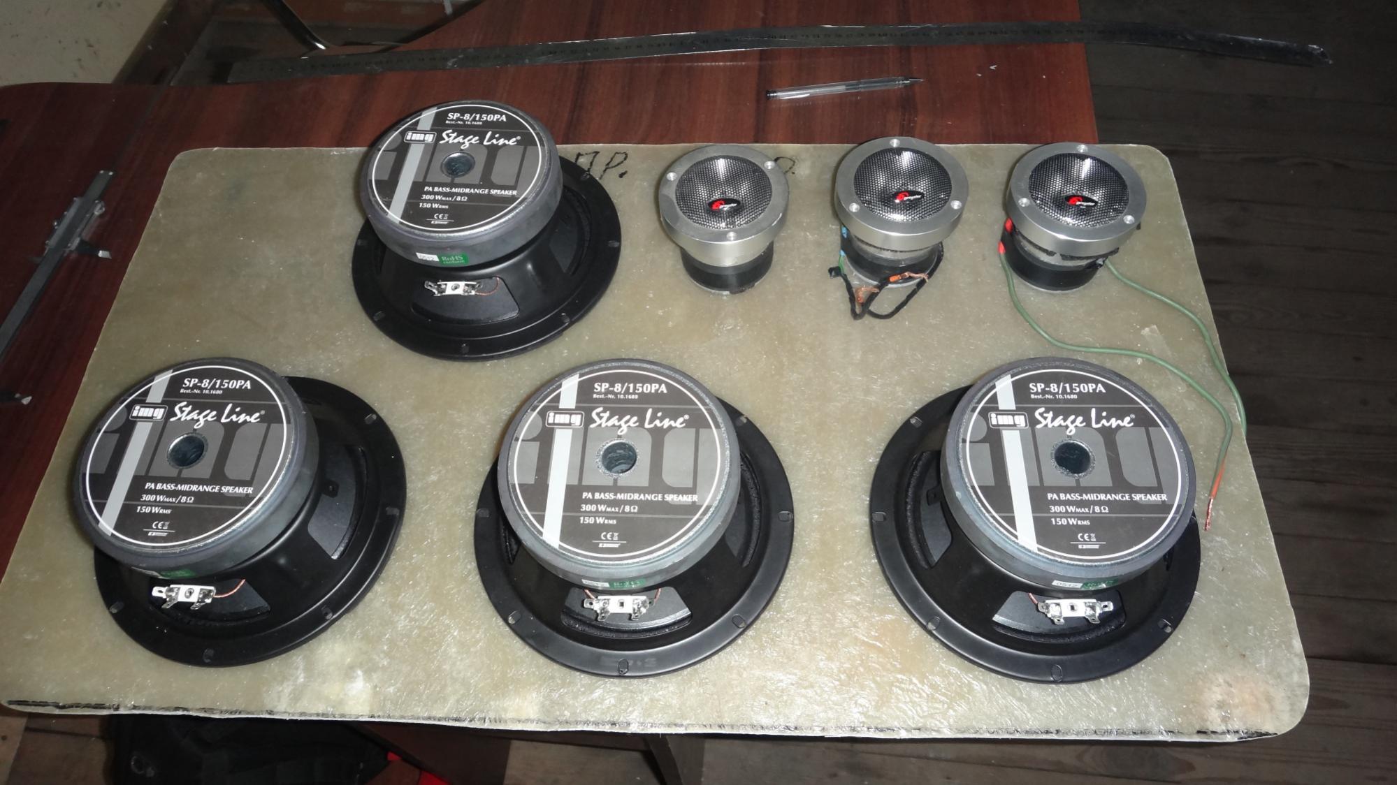Акустика, то есть динамики ( вуфера ) подбирались, под дверной объем, по предварительным ращетам приблизительно 40 - 45 литров с одной двери с подиумами, по итогу SP - 8 четыре штучки идеально подходят, им на четырех нужно корпус ФИ в 35 литров.