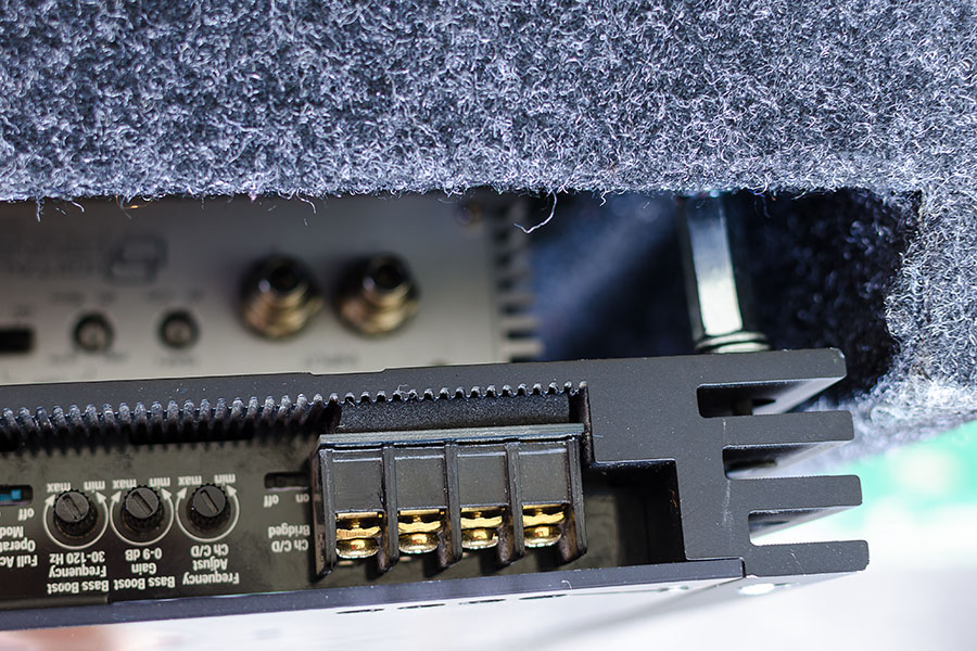 Підсилувачі розміщені сендвічем один над одним на задній стінці ящика сабвуфера. |