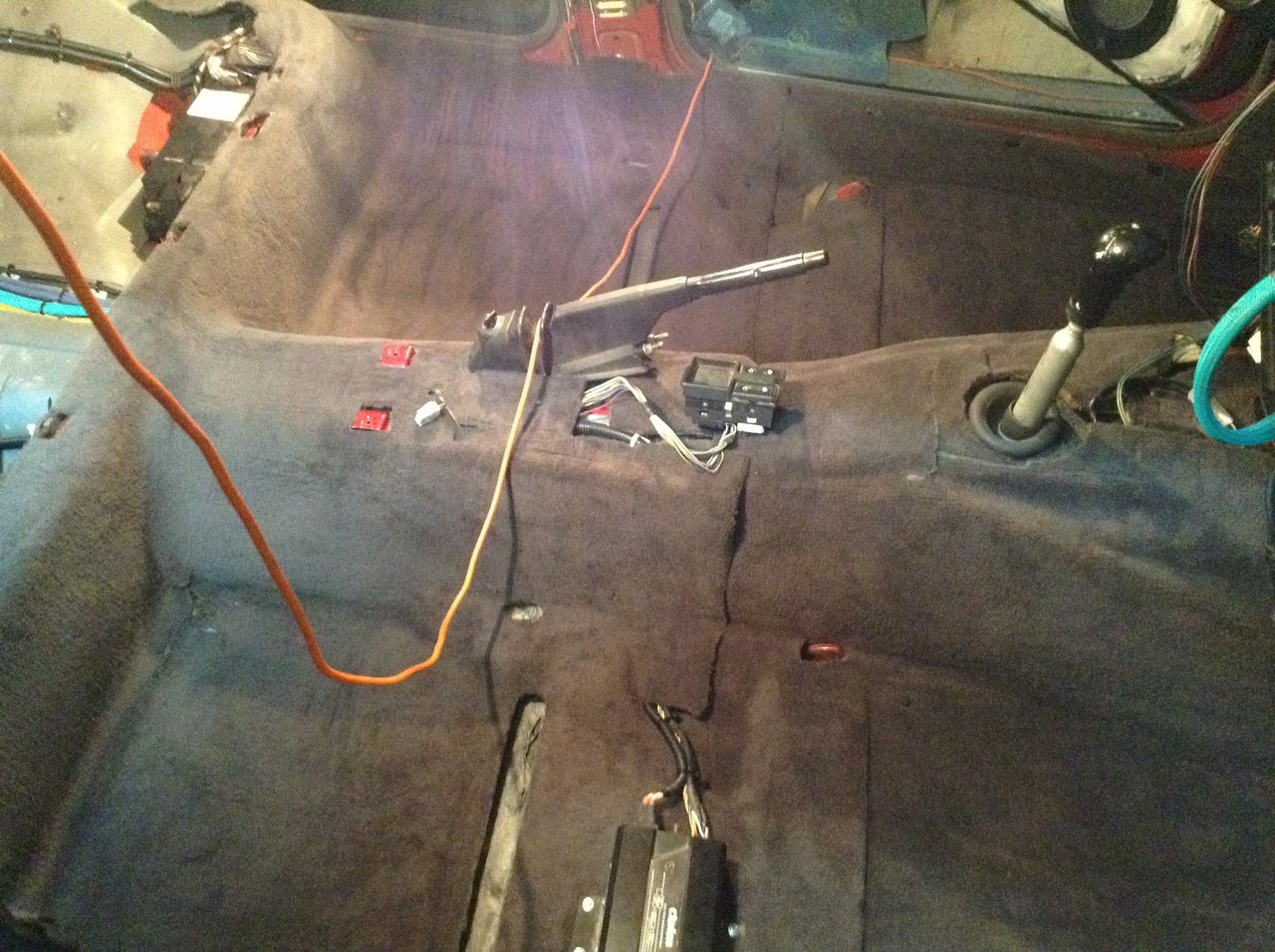 На фото видим правую сторону тоннеля (по ходу движения автомобиля). Собственно провод - под красной змейкой REM. В чёрной гофре : -Питание БП для ГУ -Се-NET для чейнджера. -"+" На ГУ Сюда же скорей всего будет добавлена и оптика, хотя думал её по потолку - хотел бы услышать все "за и против" БП для головного устройства - вход в термоусадку, крепиться через ковер болтиками - снизу просто планки с нарезанной резьбой. проход как всегда "заизолирован" по монатжу вопросов думаю нет. В сплене вырезаны квадратики и на самоклейки (скотч как правило отрываем и капаем туда жидкие гвозди). Некоторые просто прогревал хорошо и клеил. Есть фото как в нчале крепил (расстояние) потом как видим было добавлено ещё протяжка ну и увеличено количество площадок и стяжек. |