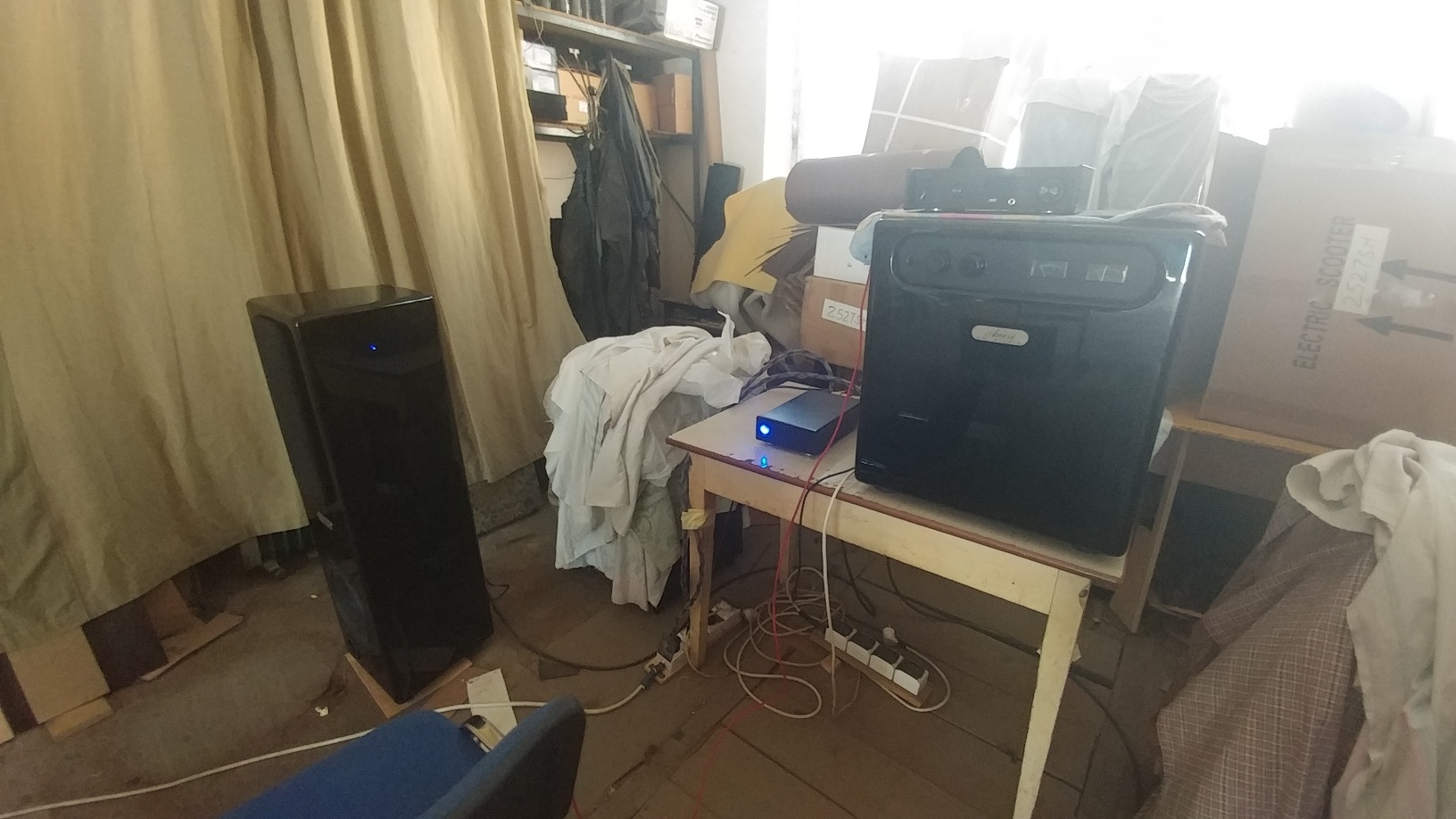 Блин, пока все перетащили ( взвесил, кстати колонку....35 кг, каждая!!), полдня прошло....кабели , акустику, усилители и др... Начал монтаж...проводов куча!(((( места мало((( Вся аппаратура встала довольно симпатично и солидно!! |