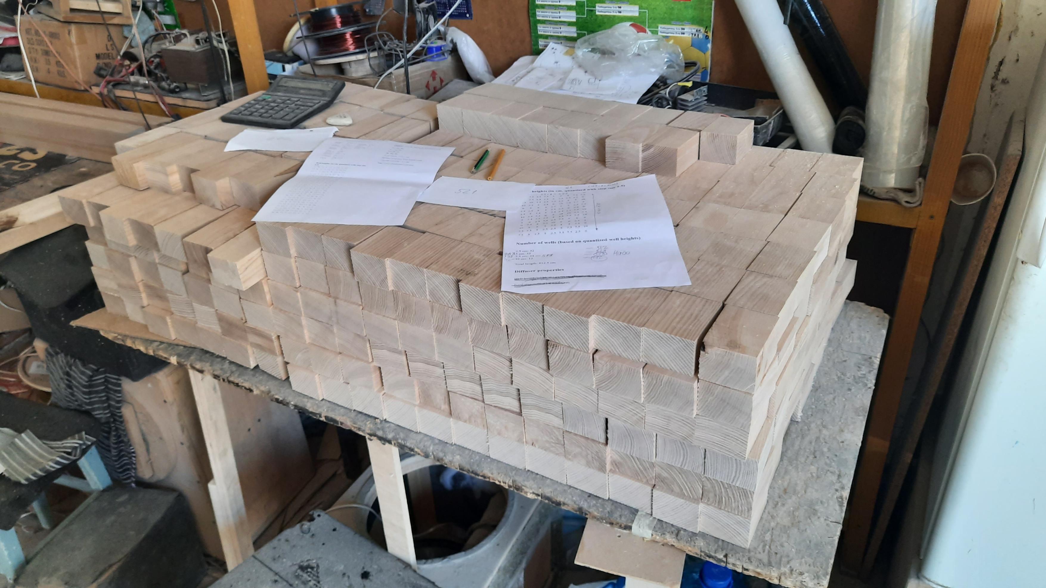 Ну и еще одна проба сил: приступили к изготовлению рассеивающих панелей Skyline. Учитывая требуемое количество и размеры панелей, заказали строганый брус из ясеня ( очень непросто было найти, кстати). Ну, а дальше...распиловка в требуемые размеры (после расчета по программе ). Получилось всего около 1800 шт!!!))) Все в пыли и опилках, руки отваливаются, пальцы дрожат от усталости.... ПАру кубиков шлифанули...ОЧЕНЬ красивые получаются, а их шлифовать и шлифовать...бесконечное количество....Ну, это в перерывах между настройками авто, в т.ч. соревновательных....