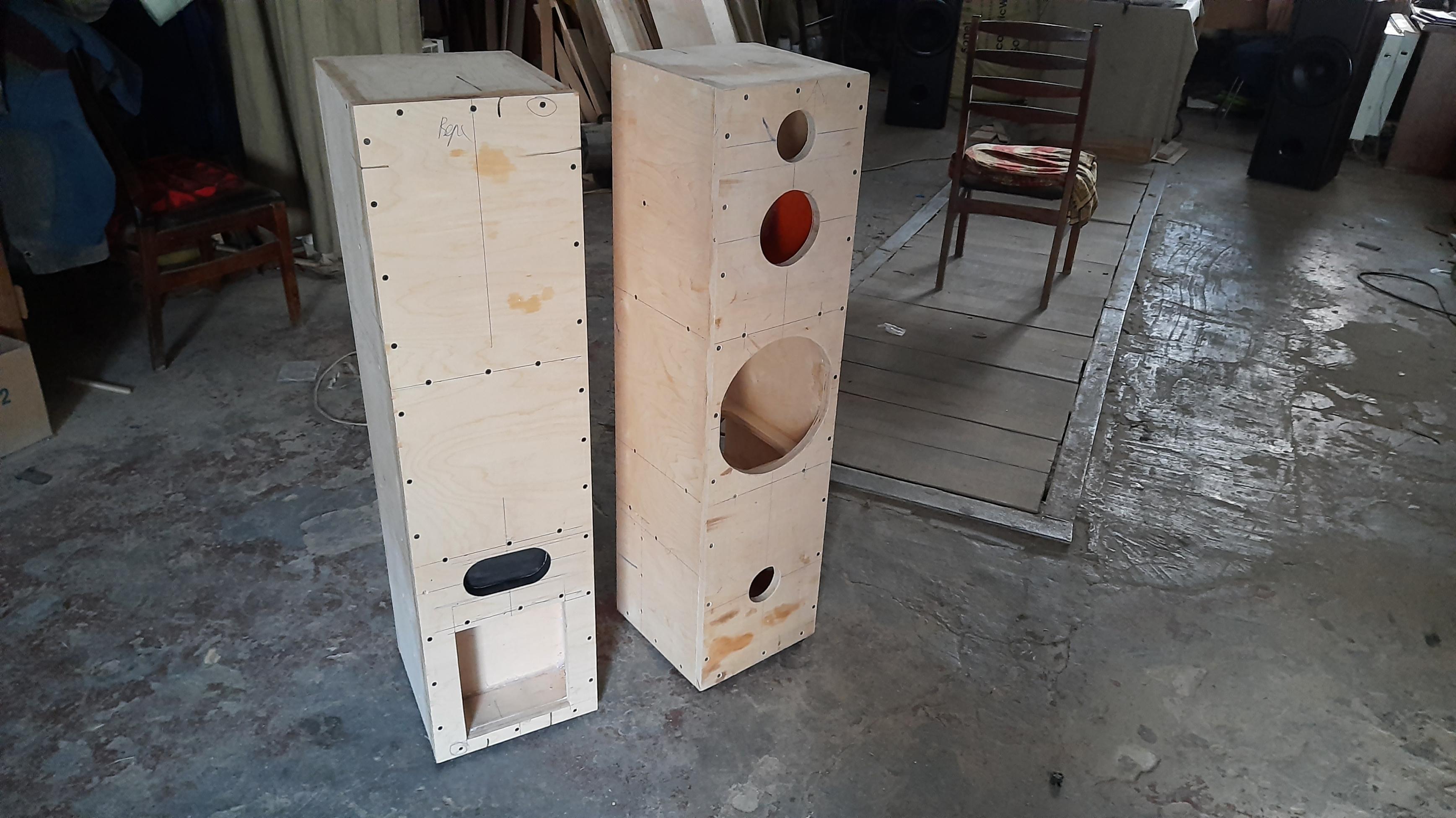 На складе залежались твиттеры Satory и басовики Eton....заказал к ним СЧ, а пока они придут начали делать корпуса...фанера 18, 21, 30мм, распорки для жесткости, полностью герметичный обьем 4 л для СЧ головки.На этот раз корпус будет единым, опять же предусматриваем вариант полностью на пасс кроссах и со встроенными усилителями D-Class для басовиков. Заказные усилители уже прибыли, будем опробовать их на имеющихся АС...