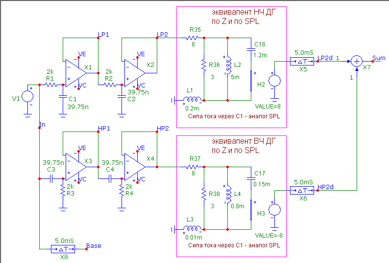 Для того, чтобы промоделировать преимущества и недостатки различных методов настройки аудиосистем, я составил такую модель двухполосной акустической системы в Микрокапе: На этой схеме V1 – генератор сигналов. На элементах X1 и X2 построен ФНЧ второго порядка Линквитца – Рили. Соответственно на X3 и X4 построен ФВЧ второго порядка. Частота настройки фильтров – 2 кГц. Выходные повторители X2 и X4 сильноточные и работают на эквиваленты низкочастотного и высокочастотного громкоговорителей. Модели громкоговорителей взяты из проекта ЭМОС и адаптированы под параметры мидбаса и пищалки (среднестатистические). Линии задержки X5 и X6 моделируют задержку прохождения сигнала от динамиков к микрофону. Сигналы от обоих динамиков складываются на сумматоре X7 и сигнал (Sum) показывает нам, что будет на выходе измерительного микрофона в точке прослушивания. Линия задержки X8 служит для правильного отображения ФЧХ системы. Для интересующихся выкладываю и саму модельку для Микрокапа 9: Согласование полос.zip |