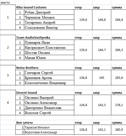 ![]() Инстал Челендж уже удался. Все ящики индивидуальны! Мої прогнози на завтра: Черников и Ко: схема повторяет удачный короб Ланоса, удаленный в торец саб и нагруженный днищем порт в противоположной стороне. Ожидаю хороший результат. Гончаров и Ко: классический порт вверх, саб вверх. Расположение элементов и конфигурация гармоничны. Ожидаю хороший результат. Сумська молодь: класичний порт вгору, саб вгору. Є деякі недоліки конфігурації і якості виконання. Не впевнений, що вони попадуть в настройки. Василівка: доволі несподіваний хід, Костя ризикує пролетіти як ... Може помиляюся, але ставку на Василівку я б не робив. Про sasha & DDMi: делался нестандартный короб перекрестной схемы: саб вверх над трубой, проходящей внутри корпуса и направленной вбок. Труба выполнена в варианте возможного удлинения на 10-15см, удастся ли удлинить завтра в настроечном режиме, не знаю, т.к. двигается она плохо, слишком плотно загнали. Без удлинения проверка схемы может не получиться из-за недогрузки внутреннего выхлопа. Прогноз на результаты (синус): Рибаки: 145-146 Колесниченки: 144,5-145,5 Васильевцы: 144-145,5 Суми: 143,5-145 Экспериментаторы: 142-146. Завтра будет необычайно интересно! Последний раз редактировалось DDMi; 12.09.2015 в 21:42. |
