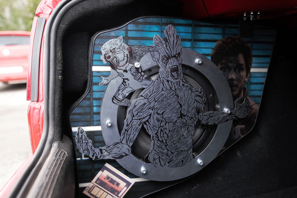 Делюсь своим очередным опытом. DISCLAIMER: Все персонажи и торговые марки, упомянутые в данном посте, принадлежат их правообладателям. Я не претендую ни на какое авторство. Пост и проект созданы в личных целях без какой-либо коммерческой выгоды. Итак, старенький Seat Cordoba 94 года. Вообще-то это машина тестя, и приехала она в Харьков из Краматорска совсем не для музыкального тюнинга. Надо было капиталить мотор. Естесственно, пожилой человек уже с трудом осилит такой ремонт самостоятельнj, вот я решил сдлеать ему такой презент. Мотор мы сделали, и мне стало скучно. Без ведома тестя, я решил немного попрактиковать свое хобби. Находясь под впечатлением от недавнего просмотра «Стражей галактики», а также от прослушивания саундтрека к фильму (а он очень достойный) , я решил создать саб в тематике «Стражей». Как обычно, размещение саба - в боковой нише багажника. Решил попробовать создать корпус stealth при помощи сендвича из деревянных панелей. Начал вырезать понемногу и накладывать панели друг на друга Собрал основную скорлупу, стянул, склеил, загерметизировал Скриншот из фильма я распечатал на самоклейке типа «Оракал». Это декор для лицевой панели саба. Вырезал лицевую панель и место под терминалы Обрабатывал внешнюю поверхность саба лепестковыми кругами, шпаклевал, шлифовал, лакировал, шкурил. Долго и муторно Примерил динамик, опорное кольцо, решетку-гриль Гравировка на решетке выглядела очень блекло и тускло. Добавил контраста Обтянул корпус карпетом. Немного накосячил со швами карпета, но это тыльная сторона, не смертельно Смонтировал лицевую панель, выровнял ее поверхность Поклеил декоративную пленку со скриншотом из фильма на лицевую панель |