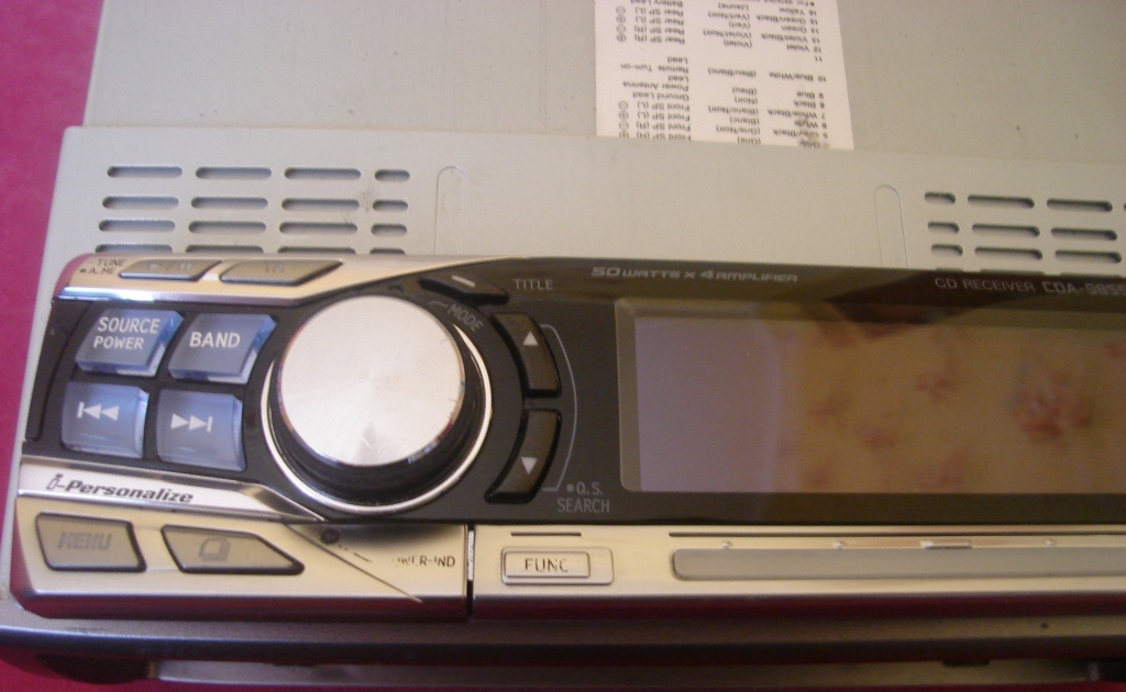Alpine CDA-9855R, в хорошем состоянии,полный комплект: голова, шахта, рамка,разьем, футляр, пульт, инструкция, немного затерта кнопка FUNC и надпись Power , остальные кнопки не затертые, работает без проблем, диски читает нормально, панель работает нормально.
