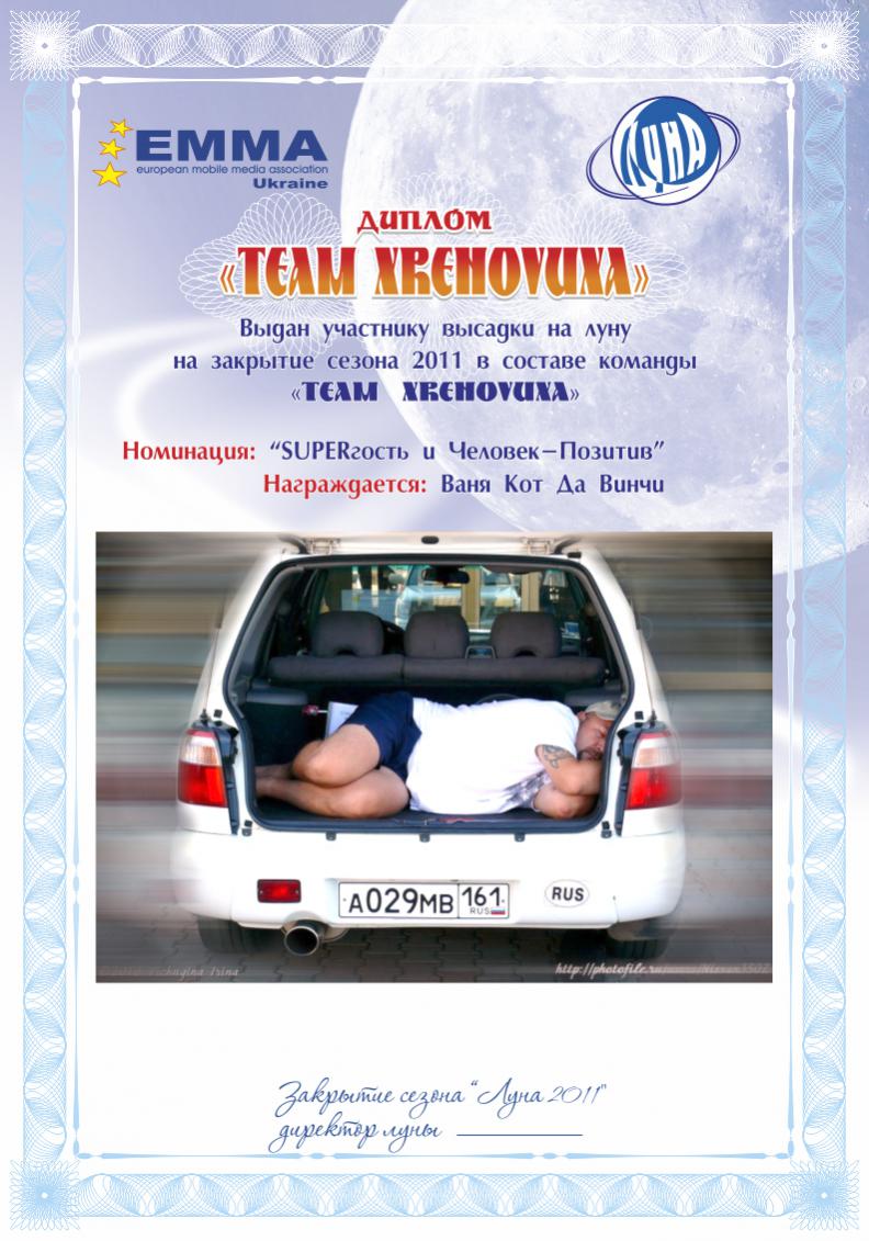 Спонсорам и партнёрам сезона 2011 были вручены благодарственные письма. Все линейные,Главные и судьи - администраторы были отмечены дипломами со словами благодарности за проделанную работу в 2011-м. Дипломы тех, кто не присутствовал - находятся у меня, перешлю. Дипломы россиян - у Полины. Единогласным решением в номинации "Спортсмен Года" лучшим был признан Марчук Вадим - Чемп Евро 2011. Диплом и Бронзовый Бюст на Родину Героя - уезжают в Винницу ![]() Всем присутствующим на закрытии были вручены памятные Дипломы об успешной высадке на Луне Настолько успешной - что некоторые до сих пор не помнят....многое