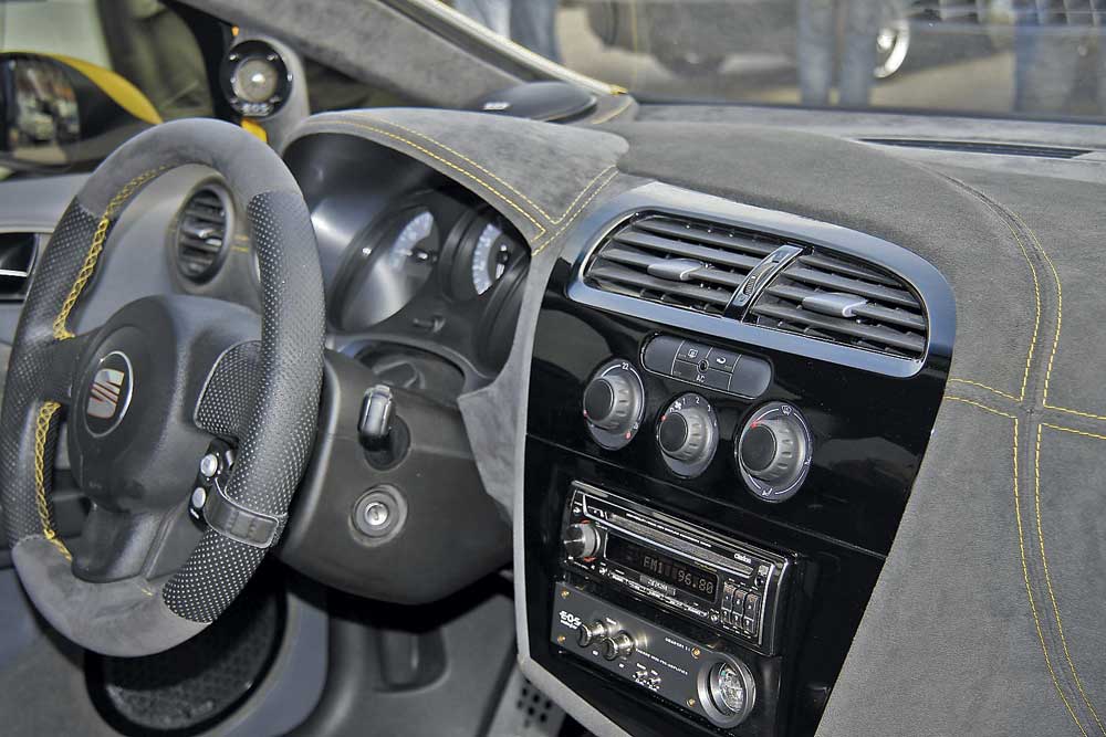 Проставочные кольца с закладными гайками под болтовое крепление динамика, жёсткое крепление колец к внутренней филёнка-карта-динамик. Вставки на дверной карте - серая перфорированная алькантара, в общем стиле дизайна салона. Карман перетянут алькантарой без перфорации. Защитная сетка динамика - штатная Сеатовская, выкрашена в "рояльный лак". Просветлять решётку не стали - замеры показали что, грубо говоря, звуку не мешает, да и в "трёшке" это не столь критично. |