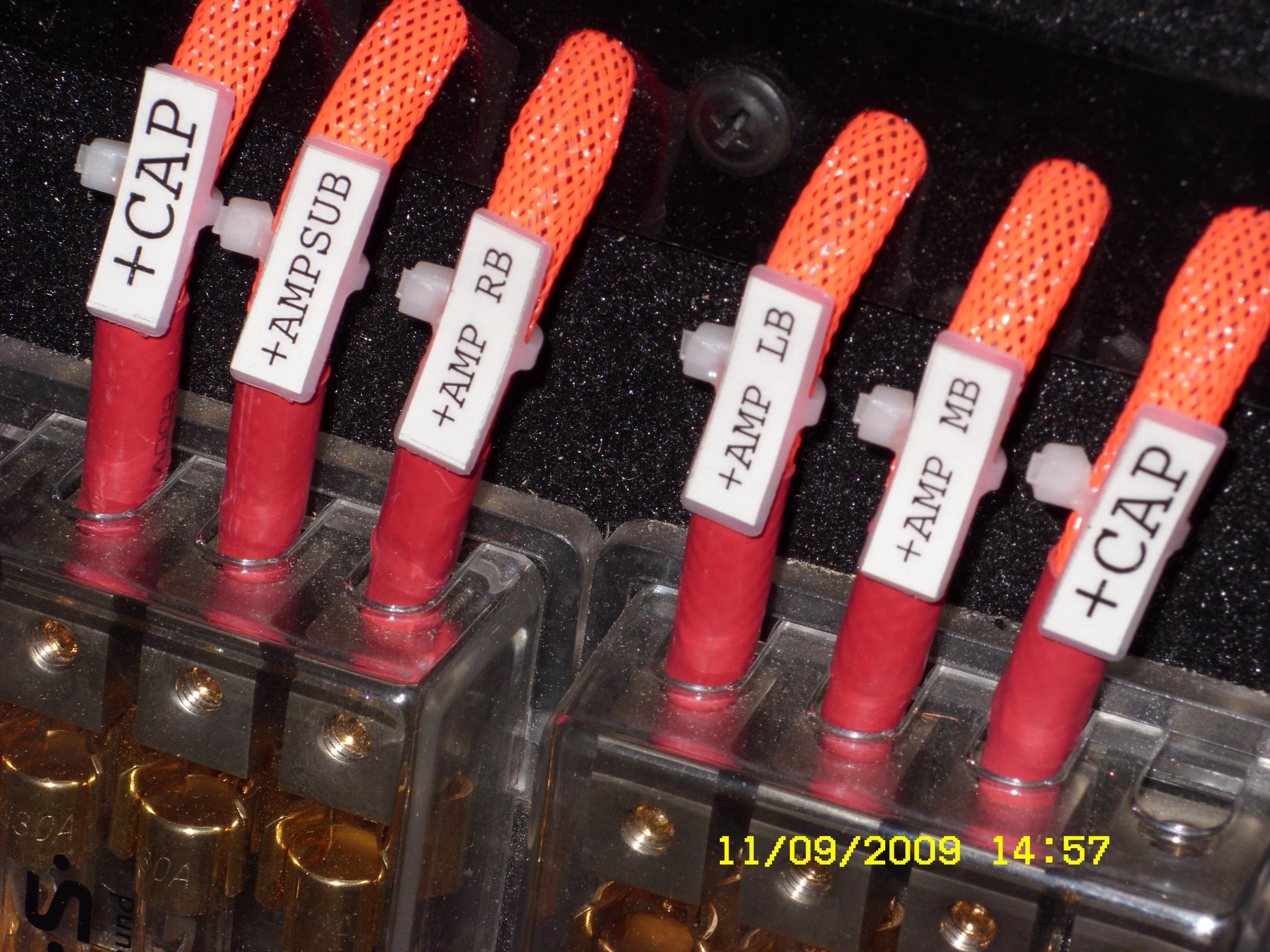 Сразу скажу - лично я не верю в шаманские танцы с бубнами вокруг межблочных и акустических кабелей. Сразу положили топовые (на тот момент) из ассортимента EOSа, положили и забыли..... Силовые 2 и 8 AWG.http://www.piti.ru/product/?id=339 Межблоки Symphony S1 http://www.piti.ru/product/?id=401 Акустические Symphony #8-15 http://www.piti.ru/product/?id=402 RCA RP-3087B http://www.piti.ru/product/?id=343 Силовая проводка. Машина была на гарантии, поэтому постарались минимально вмешиваться в электрооборудование. В штатном блоке предохранителей было место вроде как для нас специально. Изготовили распределительную шину и через соответствующие преды развели две ветки питания:2AWG ушло в район заднего сиденья и там через 2 дистрибьютера на потребители - 4 усилителя и 2 накопительных ёмкости. Два места в дистрах остались резервными, там стоят запасные преды. Минус затянули тем же сечением, из подкапотного пространства. Столкнулись с проблемой - в арсенале продукции EOS не оказалось минусовых распределителей на 4 потребителя, поэтому пришлось взять 3 двойных, изготовить соединительную шину между ними и потом развести на 6 потребителей. 8 AWG плюс и минус завели в бардачок, оттуда через плюсовой дистрибьютор и минусовой подали питание на предусилитель и конвертор ГУ, расположенный под пассажирским сиденьем. На плюсовую клемму АКБ изготовили защитную крышку. |