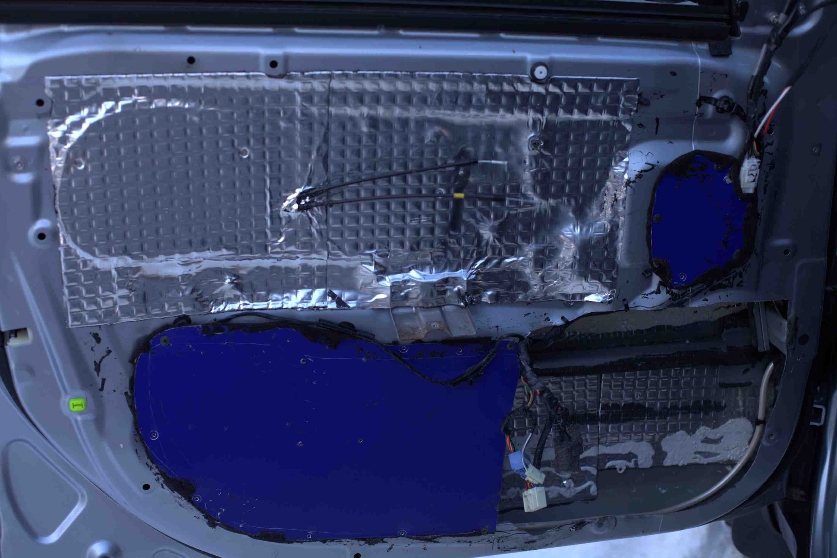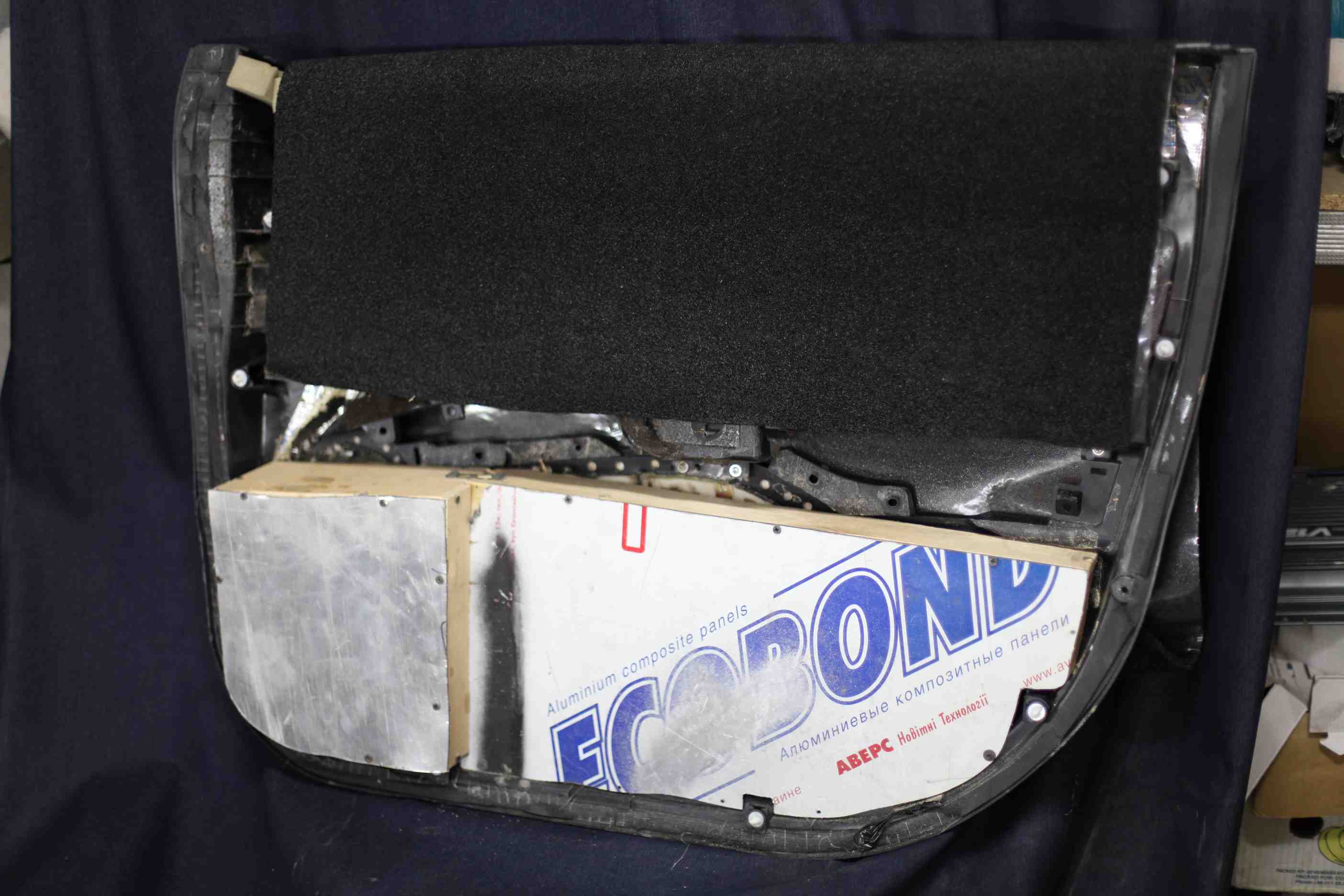 Что бы получился нужный нам обьём для мидов, с приличным растоянием за магнитной системой, пришлось поработать лобзиком. Вырезав нижнею часть дверной карты пришлось решать вопрос жосткости вот так: