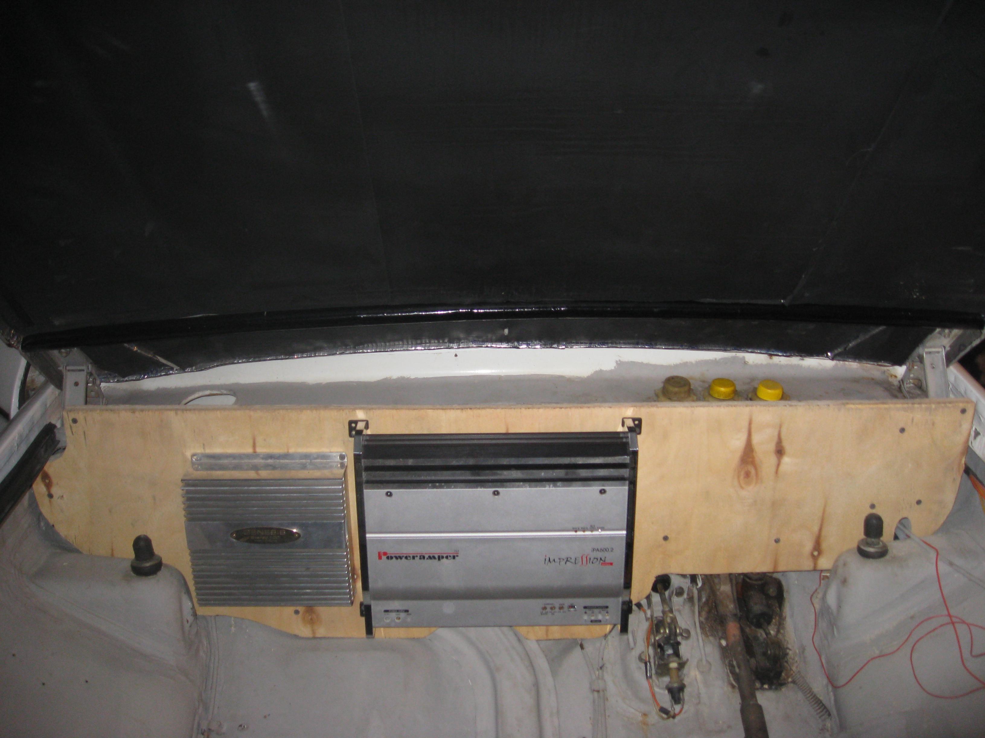 Вырезаем моторный (багажный) щит, убираем печку, стеклоочиститель ставим на планки. Там где у вас сейчас щит на котором стоят усилки- под углом вставляем колонки. По центру саб. Там немного магниты не помещаются- проходимся молотком . Еще немного переносим, прижимает трубки тормозов.Вот вам и фронтальное расположение колонок и саба. Причем колонки физически располагаются дальше лобового стекла. В общем если интересно- пишите в личку. Подскажу. Вы человек рукастый, сделаете. |