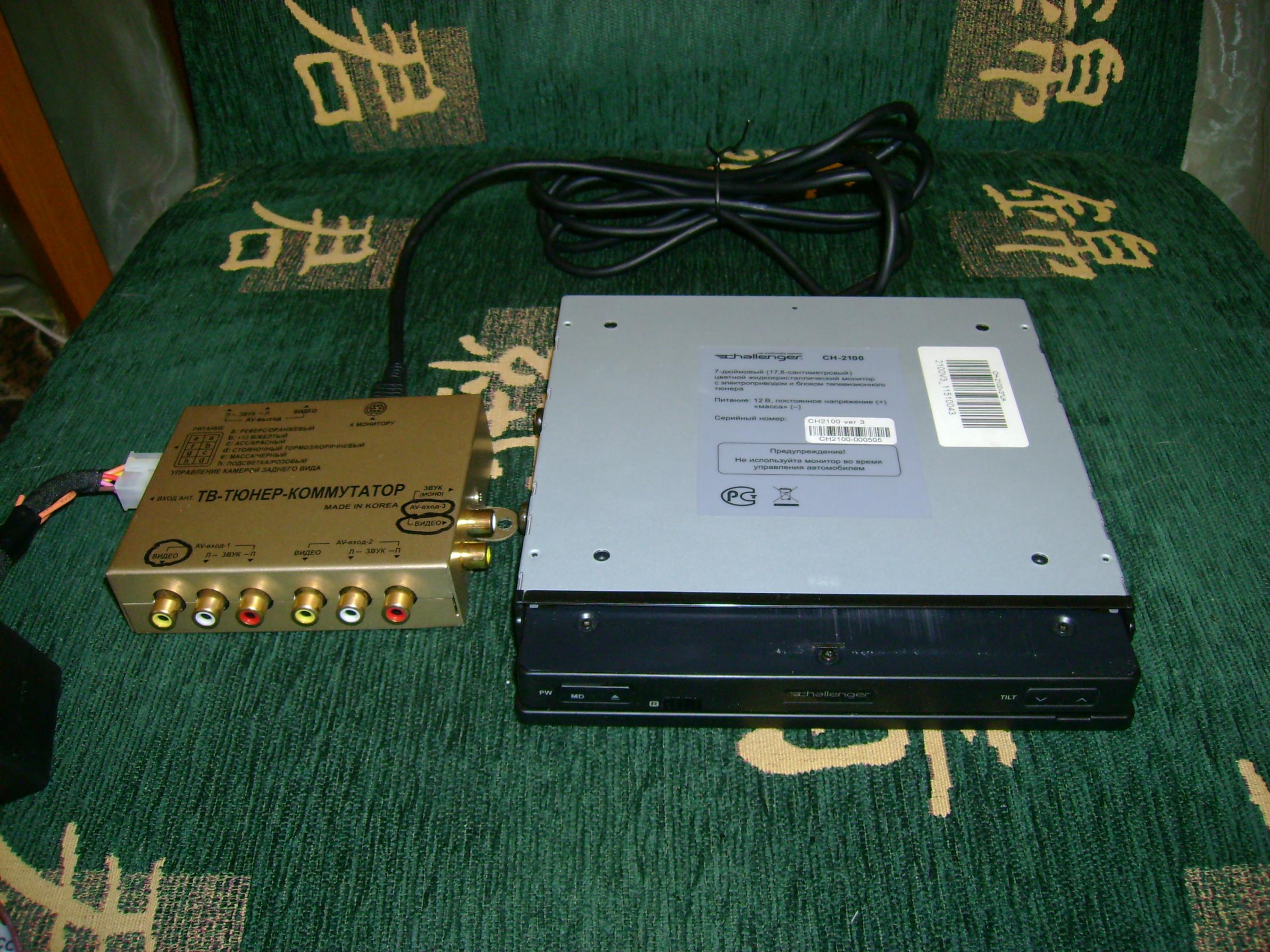 Продам выездной монитор 0.5 din Challenger 2100v3. Диагональ 7 дюймов. Формат изображения 4:3 или 16:9. Полностью рабочий, не вскрывался, не ремонтировался. Недолгое время работал в паре с медиаплеером. В комплекте есть дистанционка и комутатор-тв.приемник. Три видеовхода. Два идут в паре с линейными аудио стерео входами и один с моно аудиовходом. Соответственно есть стерео линейный выход. Аудио комутацию при желании можно задействовать для возможности регулировки звука с пульта монитора. Переключаемый вид отображения с камеры заднего вида: прямой или зеркальный. Есть сохраняемая в памяти регулировка угла наклона 8 шагов от 60 до 110 градусов от горизонта монтажа корпуса и величина вылета монитора 4 шага от -7мм до +7мм.