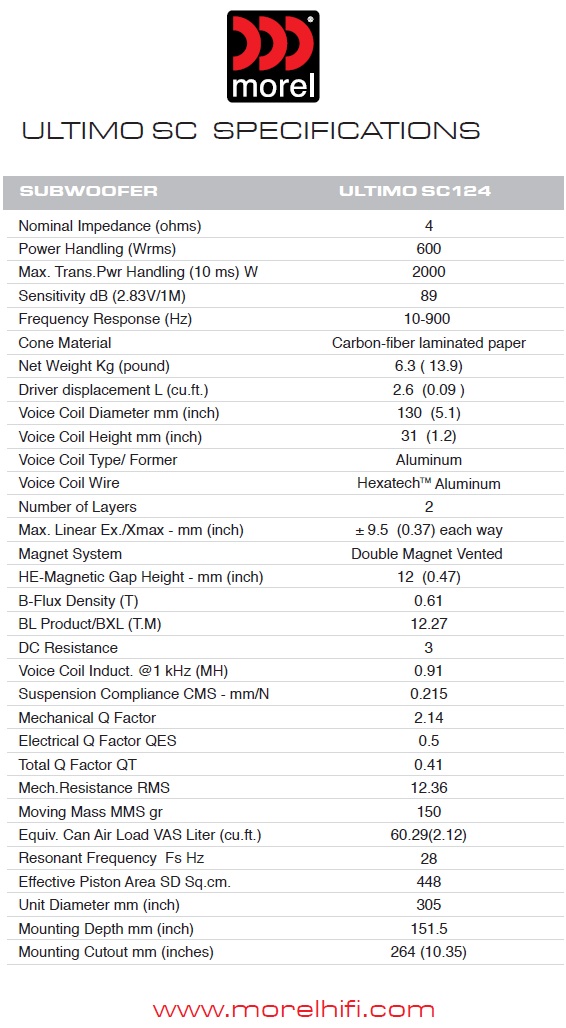 Consistent with Morels philosophy, the Ultimo SC was designed to deliver innovative engineering resulting in extraordinary combination of audiophile bass quality and high power output at a great consumer value. The Ultimo SC employs some of the best technological features of the Ultimo subwoofer such as a gigantic 5.1” Hexatech™ External Voice coil (EVC™), a hexagonal-shaped aluminum coil wire (2-3 times thicker than standard subwoofers) that is used for accurate music reproduction and for superior durability and power handling. A highly efficient magnet system – DMM™ Double Magnet ferrite Motor that maximizes the magnetic field (over 90% efficiency).