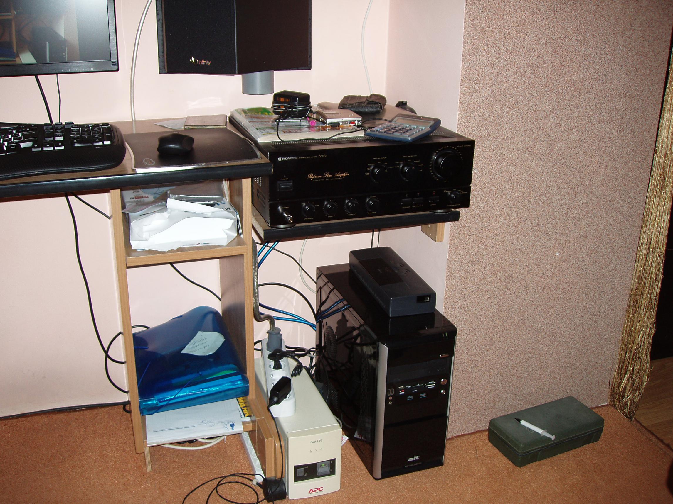 А вот и обещанная мною вчера система. Краткое описание. Компютерная система SaNyCo XE-01 (2+1) была куплена лет 5-6 назад и некоторое время экспуатировалась как есть, но ручки-то чешутся чегой-то усовершенстовать. Так как прошлые усовершенствования были несущественными, я их упоминать не буду. Суть настоящего усовершенствования - середи кучи б/ушных 10см мерседесовских широкополосных динамиков (Спасибо Малхазу!) была найдена пара хороших и встроена в пластмассовую фасонину диаметром 10см (колено и переходники) и 5см (труба). Для фиксации к столу использованы оригинальные крепежи для канализационных труб. Динамики вклеены (термоклей) в фанерные кольца, а те уже привинчены внешними саморезами. Дополнительно герметизированы термоклеем по кругу. За динамиками рыхло размещен синтипон. Тонкая труба, она же кронштейн, она же фазонтертор пуста и снизу открыта, ее длина 110см. Акустический провод сечением 2х1,5 кв.мм. Sommer cable куплен в магазине музыкальных инструментов и припаян напрямую к плате усилителя с одной стороны и запрессован в латунные "мамки" с другой. Как все закреплено видно на фото. Ширина стереобазы 1300мм.