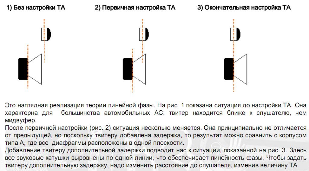 2)представить это можно, и картинка вроде бы логичная: все что надо для счастья это ввести задержки излучателей между собой как по картинке в зависимости от линейкой измеренных параметров. Но есть скрытый момент-реально: -ВЧ,СЧ,НЧ как правило имеют разную чувствительность, разную скорость отклика на импульс усилителя, и разную скорость нарастания сигнала в разных усилителях на фронт на каждый излучатель в отдельности. -по этой причине вводить указанные линейкой измеренные расстояния есть смысл при одинаковых параметрах излучателей ВЧ-СЧ-НЧ на фронт и одинаковых параметрах сигналов усилителей на эти компоненты Меня терзают смутные сомнения по поводу данной методики именно по вышесказанным причинам. Коротко пример: дальше мидбаса расположенный резкий активно орущий СЧ придется задерживать именно на слух а никак иначе. |