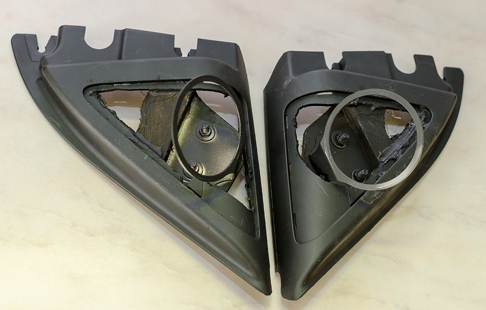 Вирішив таки заморочитись з заміною фронту. ВЧ зроблені текстильним способом на базі штатних кутиків дзеркал, які обтягнуті акустичною тканиною. Все максимально просто.