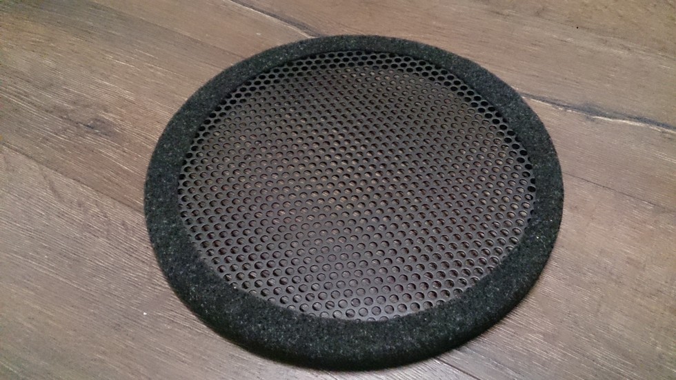 На выходных, опять таки благодаря NOS-у и ребятам сделал новый гриль из перфорированного металлического листа и фанерного кольца. У ребят вырезал кольцо. Потом сам уже вырезал сетку, покрасил всё и собрал, ну и обклеил карпетом. Стал как влитой. Крепить не нужно вообще ибо стоит плотно, да и сверху будет постоянно придавлен ковриком. Данная сетка намного жёстче чем у фабричного гриля. Рукой почти не продавливается. так что думаю хватит. В начале думал психануть и в 2 слоя сетку сделать, а между слоями аккустическую ткань. Но ткани не было под рукой + в лобзике села батарейка и вырезать вторую сетку просто физически не получилось.