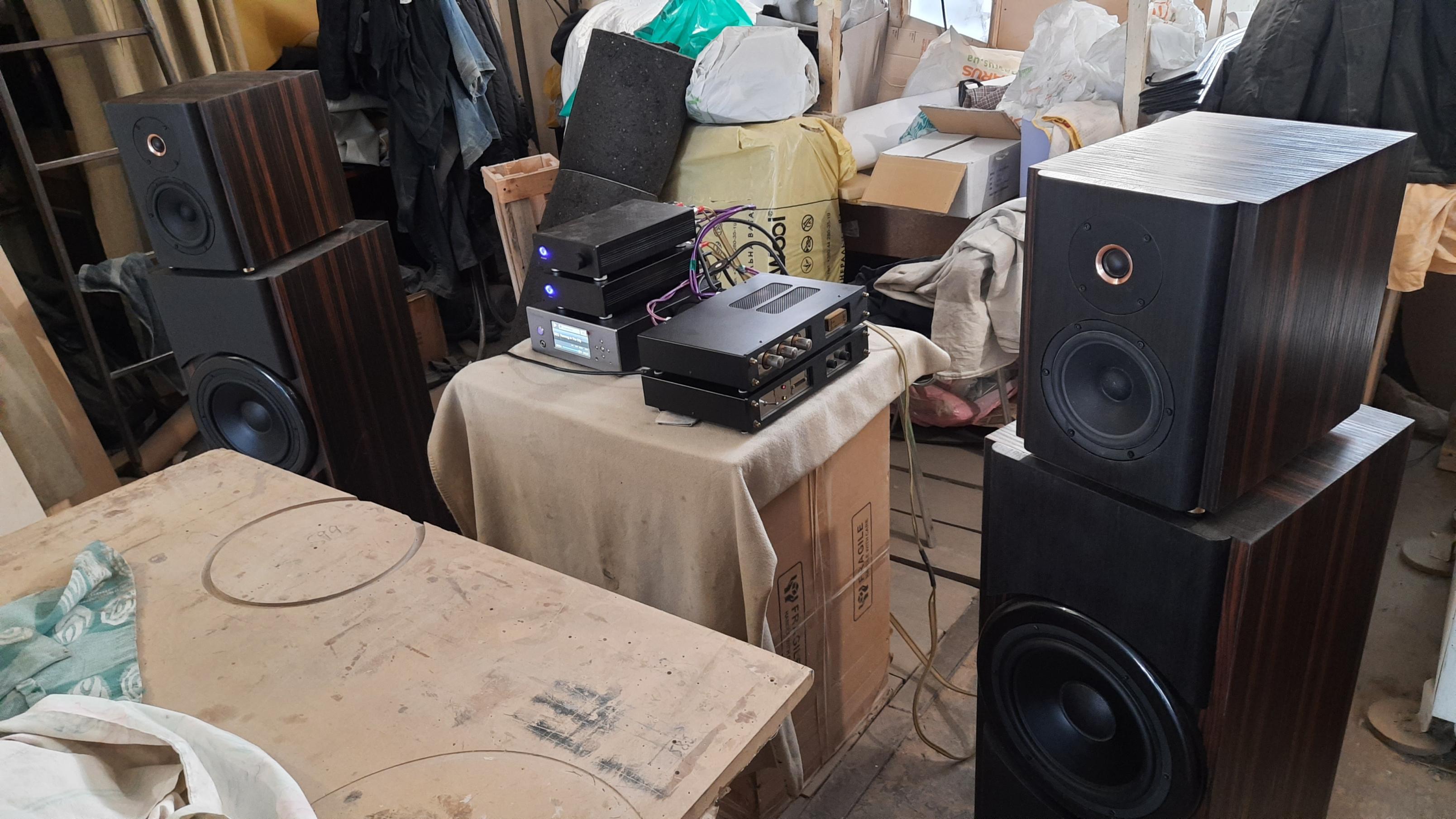 Постепенно наполняются корпуса комплектацией: смонтированы ВЧ головки и блоки усилителей НЧ, остальное пока что в работе....