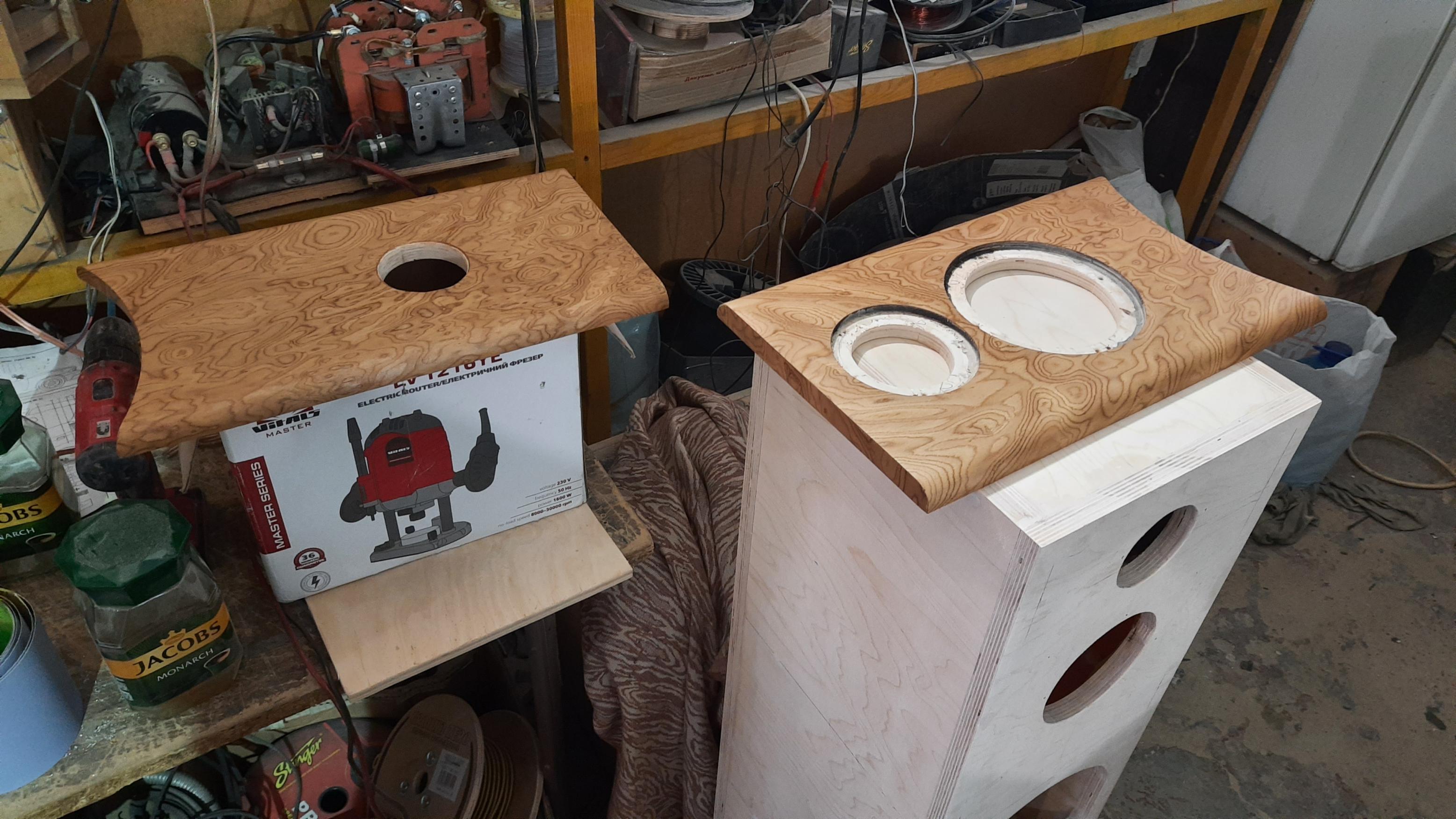 Отделка шпоном, шлифовка и покрытие корпусов завершены...получилось аккуратно и гармонично. Заодно отработали и улучшили качество отделки корпусов. Изготавливаем пасс кроссы для СЧ /ВЧ блока, ожидаем головки и продолжаем монтаж АС...