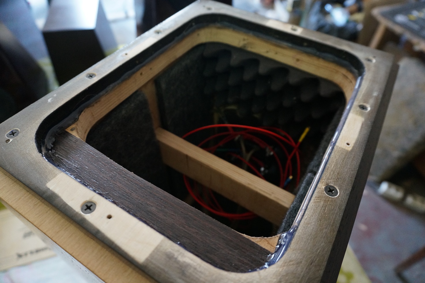 Cегодня закончили шпонирование старых колонок для клиента... И нанесли в 4-й раз покрытие на наши АС... Мда, с каждым слоем покрытия внешний вид улучшается... Интересно, что под разными углами и при разном освещениии заметно меняется оттенок и структура...Очень прикольно!!! Завтра с утра скорее всего нанесем и 5-й слой...