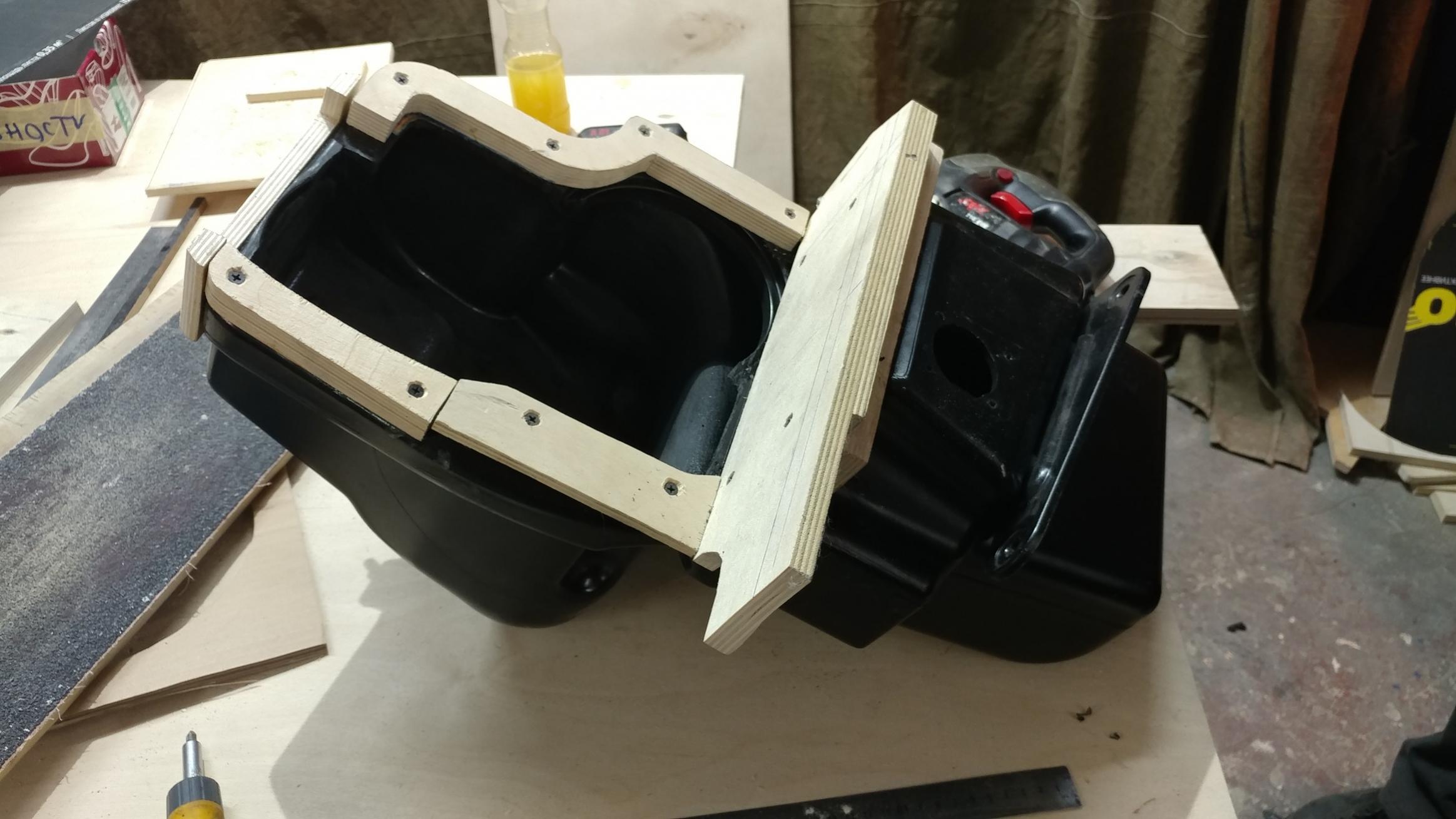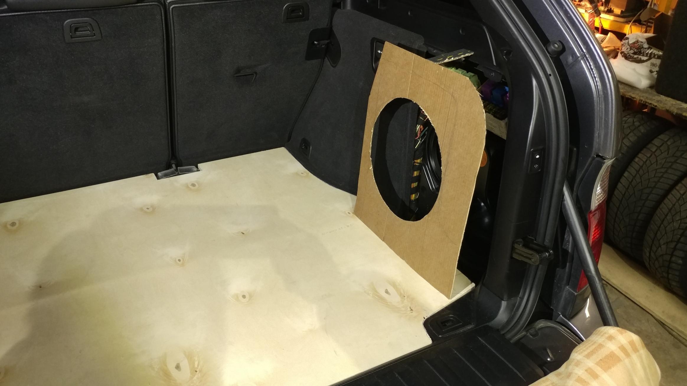 Приступили к изготовлению корпуса саба...используя штатный, заметно его усиливая...полиэфирная смола, фанера и т.д. Заодно увеличиваем обьем до...примерно до 20 л. Мидбасы приняли решение установить на картах....соответственно готовим прочный подиум, усиливаем шумовиброизоляцию карты
