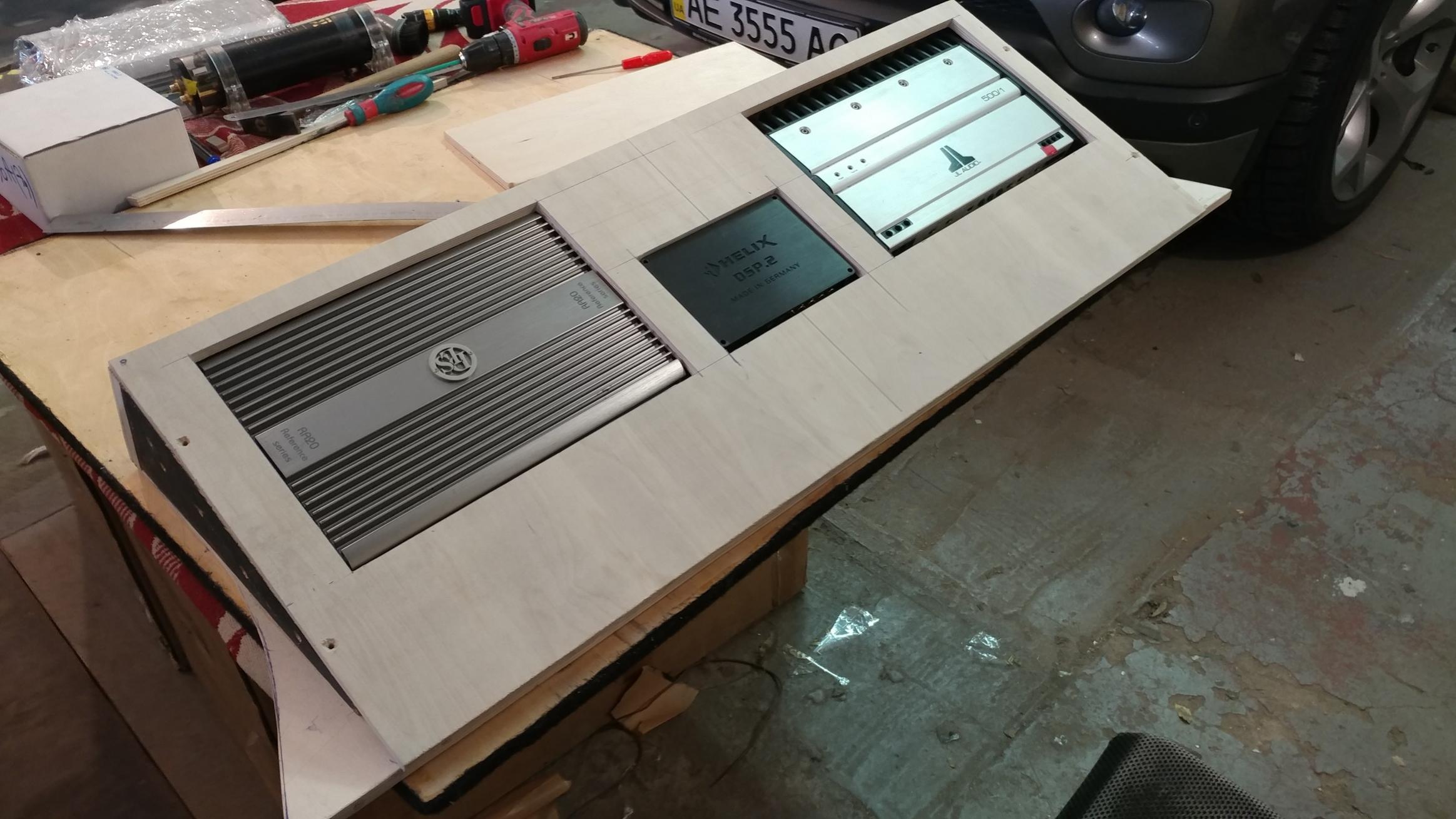 Продолжили расширять и укреплять фанерой и полиэфиром штатный обьем саба. Установили твиттеры на штатные места...плохо, конечно, но....вариантов нет. Разместили часть усилителей и процессор в аппаратном блоке