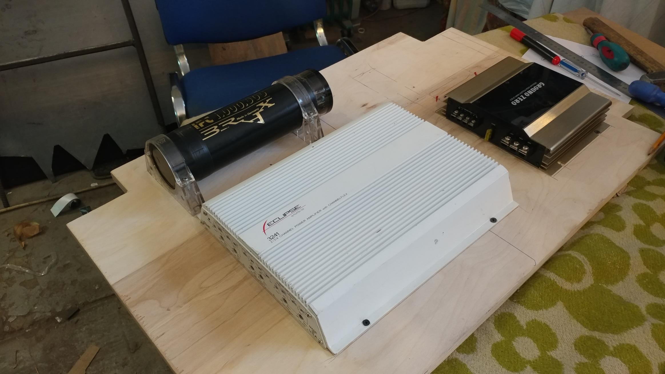 Выведены все провода и кабели к месту расположения усилителей, процессора, конденсатора...клубки за задним сидением))) Установлены мидбасы....как говорится с зазором на краску..еле впихнули. Панель для размещения всей аппаратуры подогнана в нужный размер, определено ее крепление. Предварительно размещена аппаратура на панели...вроде все поместилось и удобно будет при надобности крутить регуляторы на усилителях...... Очень сложной формы корпус саба наконец то завершен...вцелом ( и настроен...без динамика...) При испытаниях мидбасов от внешнего усилителя слышны неприятные призвуки...а это , как и предупреждал наш КОЛЛЕГА Артем из ААС , дребезжат и резонируют наружные пороги.. Придется снимать и шумовиброизолировать...