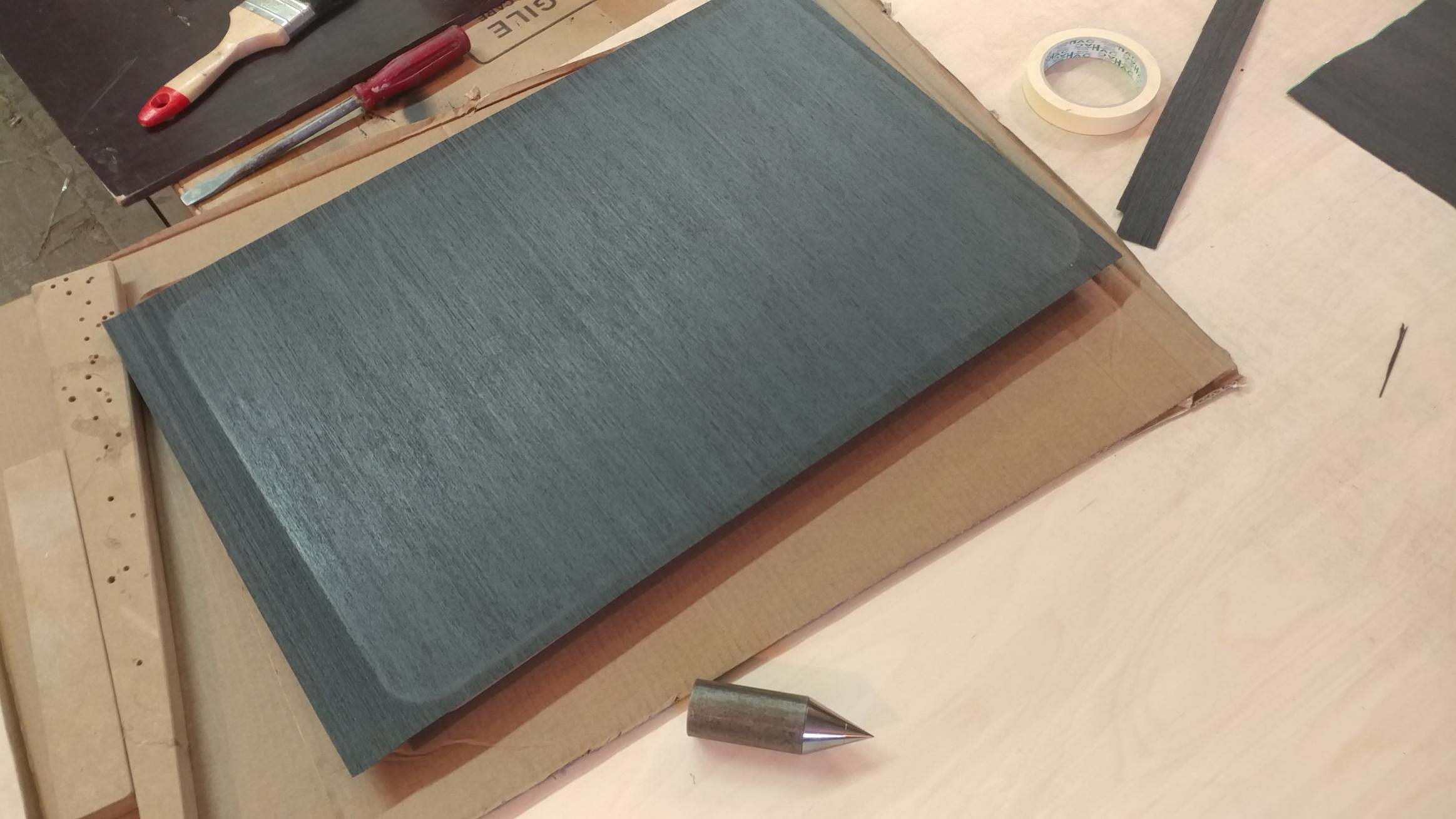 Итак, начали шпонирование....Ох и непростая это работа, тем более в прохладном боксе(((( Обдуваем детали и рабочее место тепловентилятором... Конусы с требуемой длиной шпилек подготовлены, медленно , но движемся.... Перерасход практически во всем.... не хватает спец клея...дозаказал, не хватило калиброванного круга...дозаказал, не хватает шпона...дозаказал...Главное качество и результат...