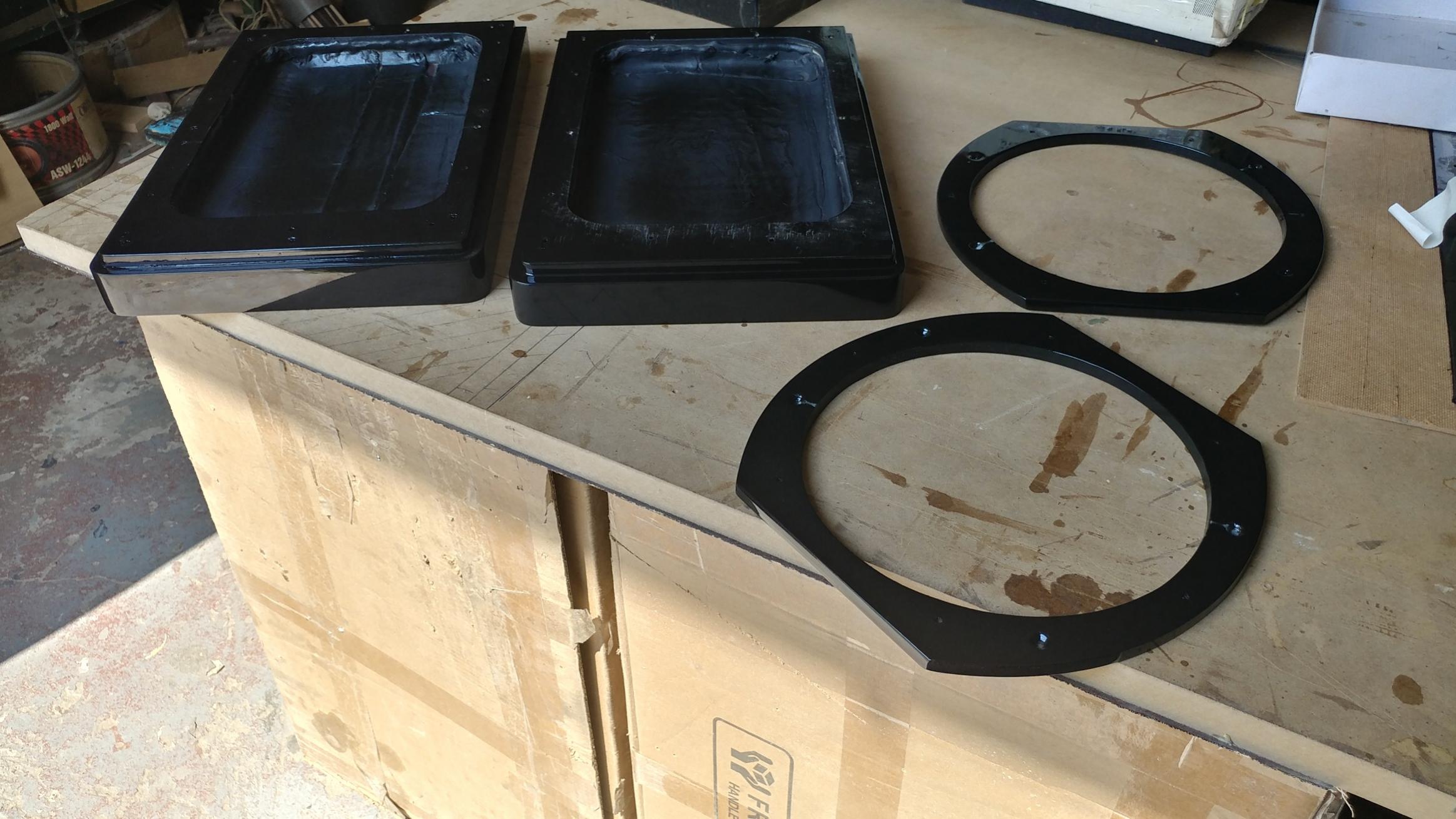 Пока появилась небольшая пауза в автомобильных делах немедленно продолжили заниматься любимым хобби: примерили басовики...отлично встали в корпуса...как вкопанные)) Ну и.... начали финишную шлифовку шпонированых оверхностей...блин, бесконечный процесс, если хочешь получить достойное качество!!