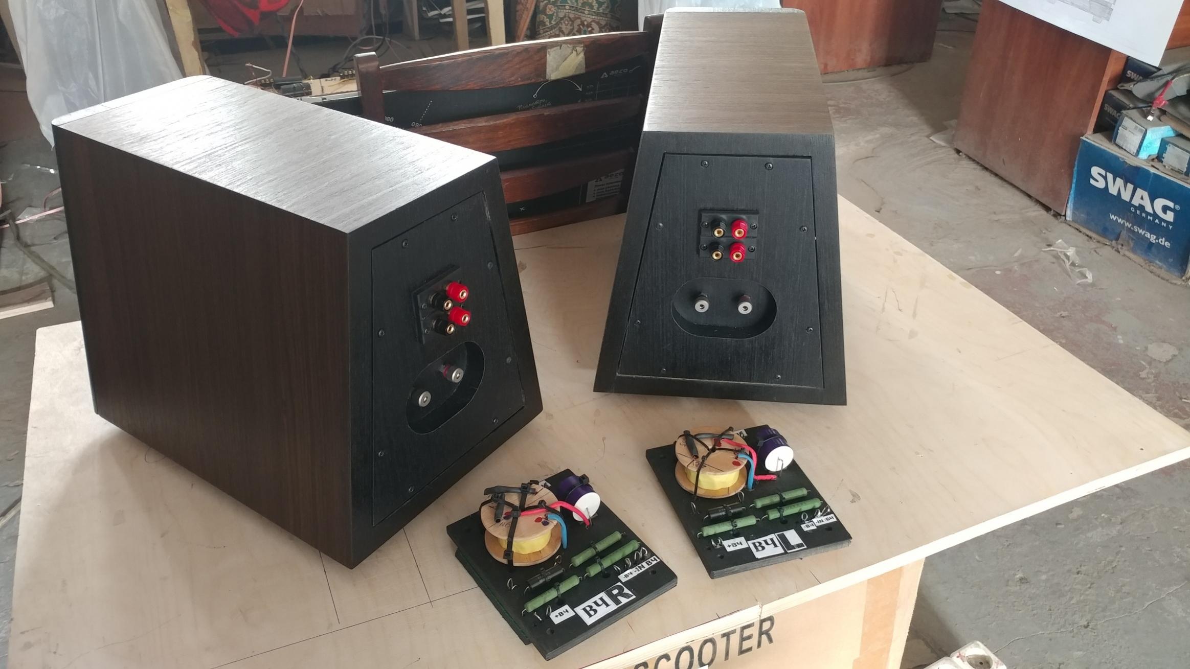 Близится к завершению сборка...смонтировали ВЧ кроссоверы на платы, установили в корпусы ВЧ и СЧ. На задней стенке корпусов ВЧ и СЧ вынесли дополнительные акуст. клеммы для установки при необходимости перемычек...подьем СЧ и ВЧ на 2,5 дб. Это бывает нужно при отстройке в конкретном помещении...