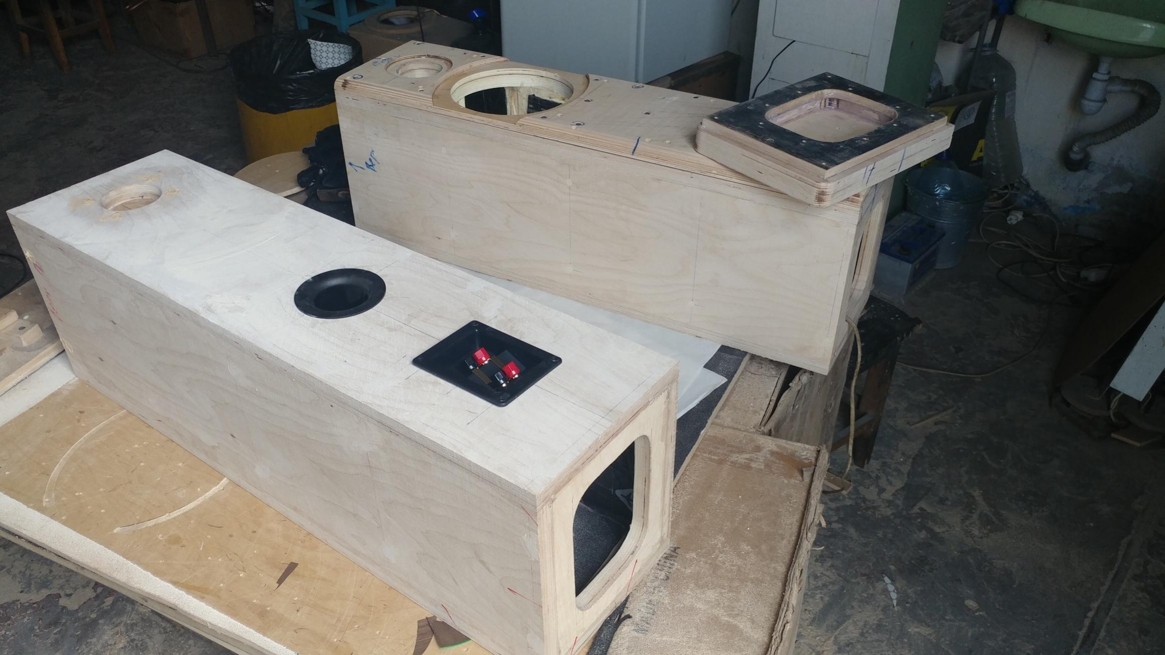 Две ночи не спал, слышался вещий голос Монохреновча.....далеко разнесены динамики... А он в ...17% случаев бывает прав!! Поэтому заделали старые посадочные отверстия под НЧ динамик и перенесли его ближе, практически вплотную...к ВЧ. Ну и , вчерне завершили изготовление корпусов, подготовку под шпон... Переходим к изготовлению пасс кросов, они уже рассчитаны, комплектующие и материалы под них получены...