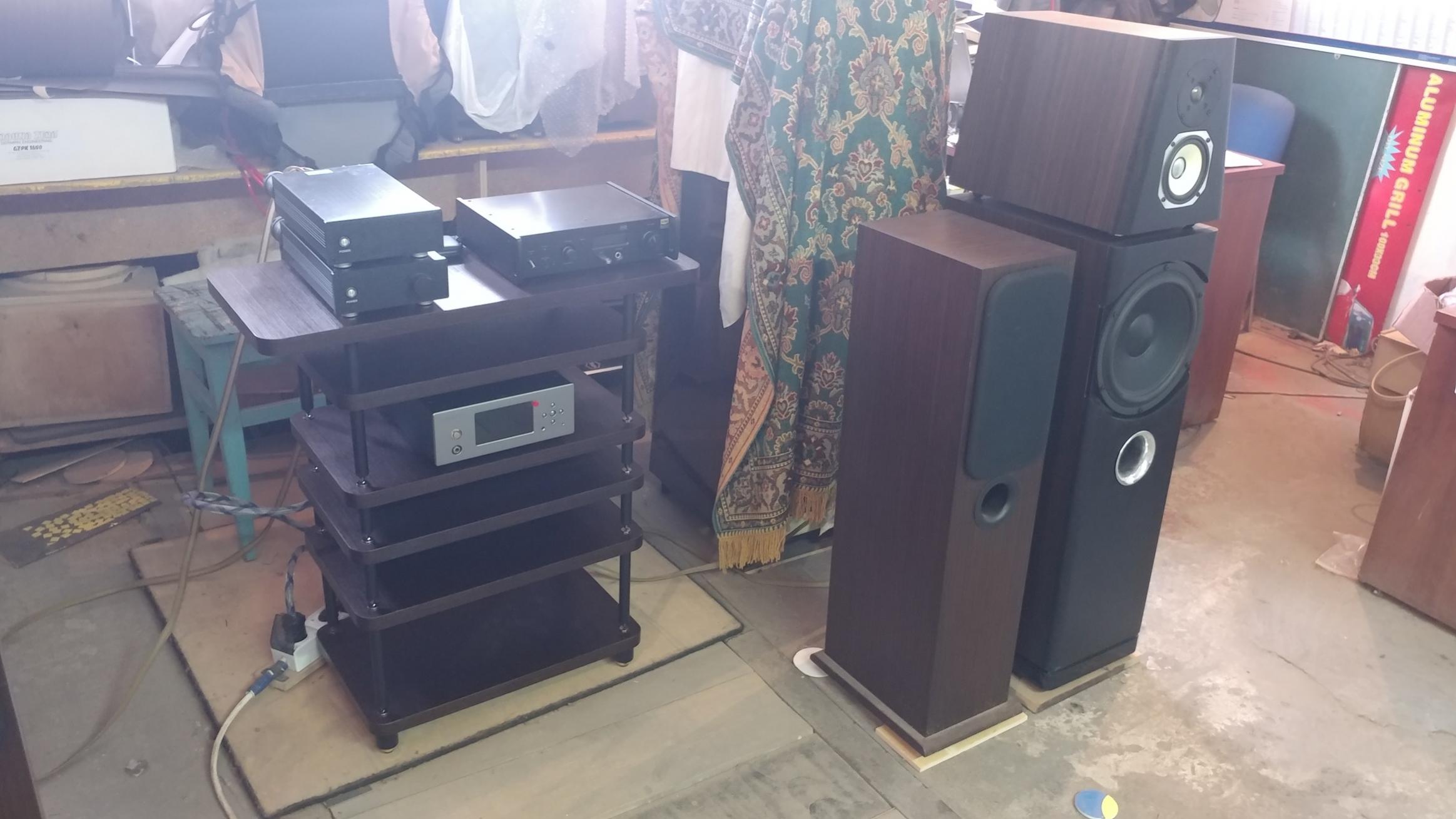 Но важнее другое....вечером АС внимательно прослушали 2 фаната-ценителя качественного звука. ИМ понравилось ВСЕ! Сцена, тоналка, фокусировка и др... Одному показался более ярким, чем он привык, ВЧ диапазон, но без искажений... Но и не это самое главное...А самое важное для меня то, что у этого коллеги домашка ОЧЕНЬ знатная: акустика B&W Matrix 801, оконечник Mark Levinson 431, предвар Mark Levinson 28, цап Denon c1, транспорт Wadia какой то...ну и под стать кабели и прочая мишура. Так вот при наличии такого СОБСТВЕННОГО набора он неоднократно отметил, что звучание АС Tower ему ОЧЕНЬ нравится...Вот это приятно, мы на верном пути.....НАдо будет мо*****овичу сказать ....что его конденсаторы, опорные конусы, акустические клеммы, демпфирующие материалы..... и дельные советы....все в этом проекте!!!