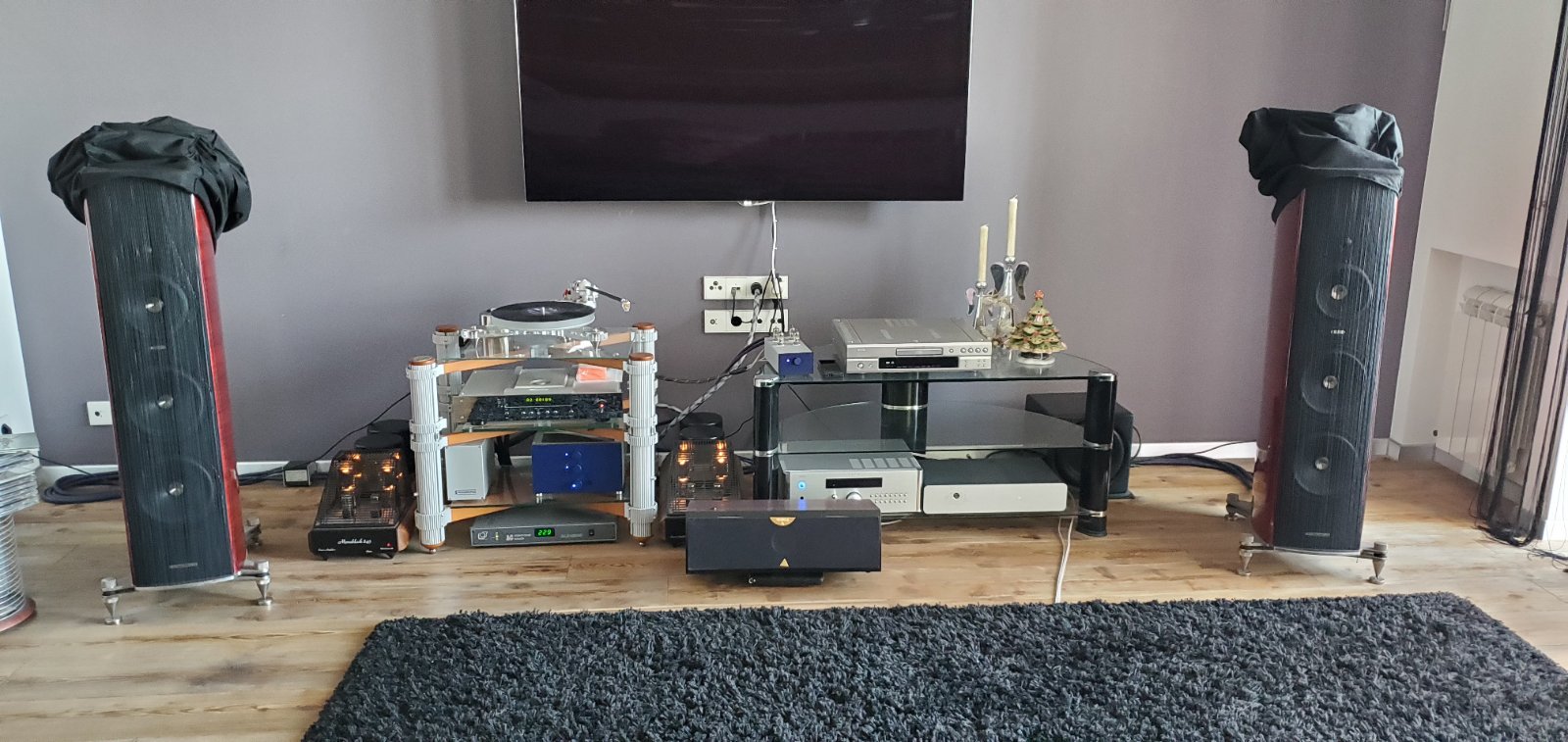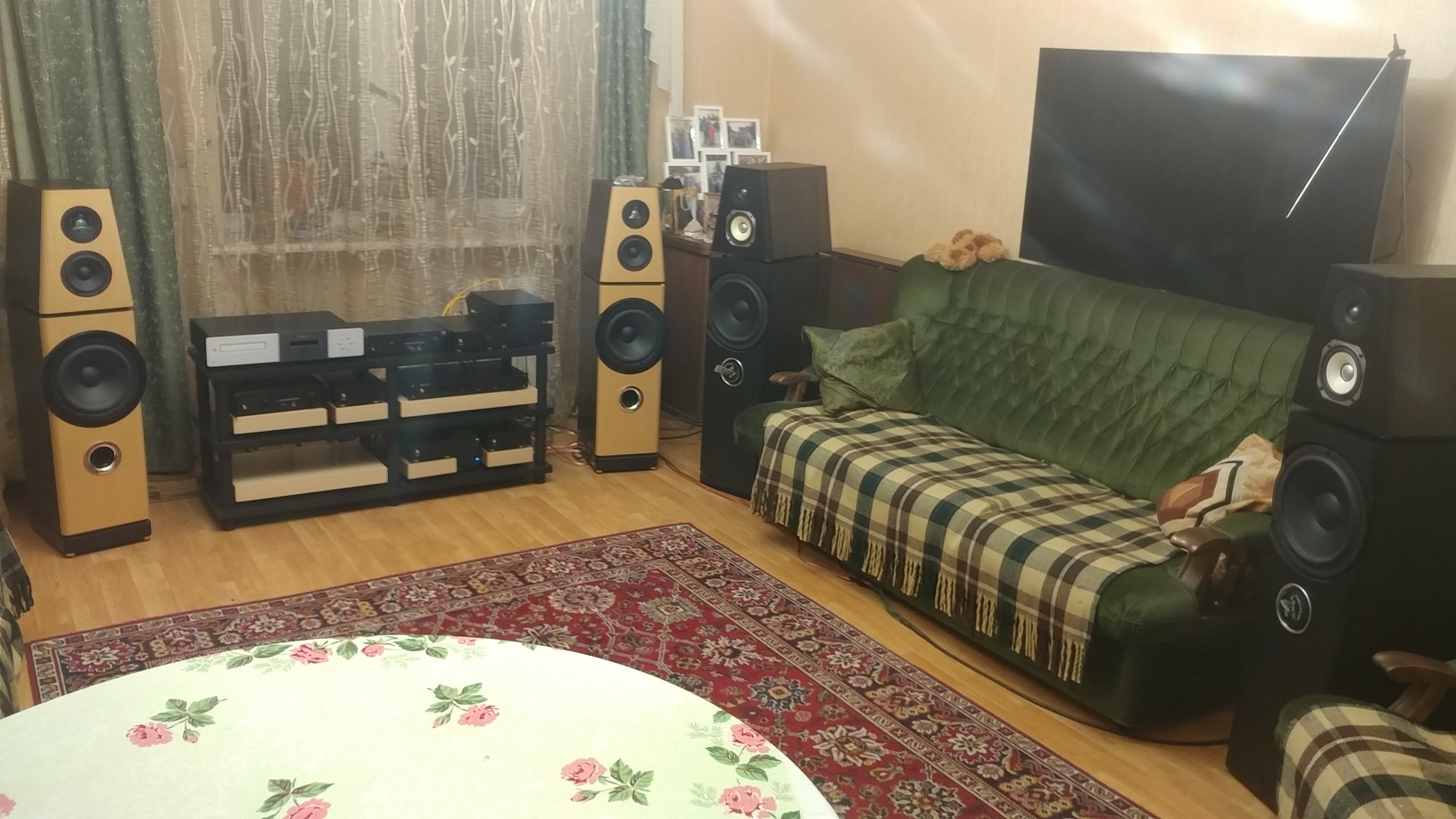 Наконец система предварительно размялась...примерно 20 часов...и начал прослушивание. И пошло перемещение аппаратуры, а именно АС по периметру комнаты: ведь звучат АС везде по разному, особенно бас. Его уровень сильно зависит у какой стены АС расположены. Но видимо , когда бас приятный, качественный, не гудит, рельефный...то его хочется побольше. Остановился пока на варианте расположения АС по обе стороны от ТВ. ...как на фото.Я специально опробовал обе АС ( активную и с пасс кроссами ), чтобы убедиться в одинаковом воспроизведении ими баса....