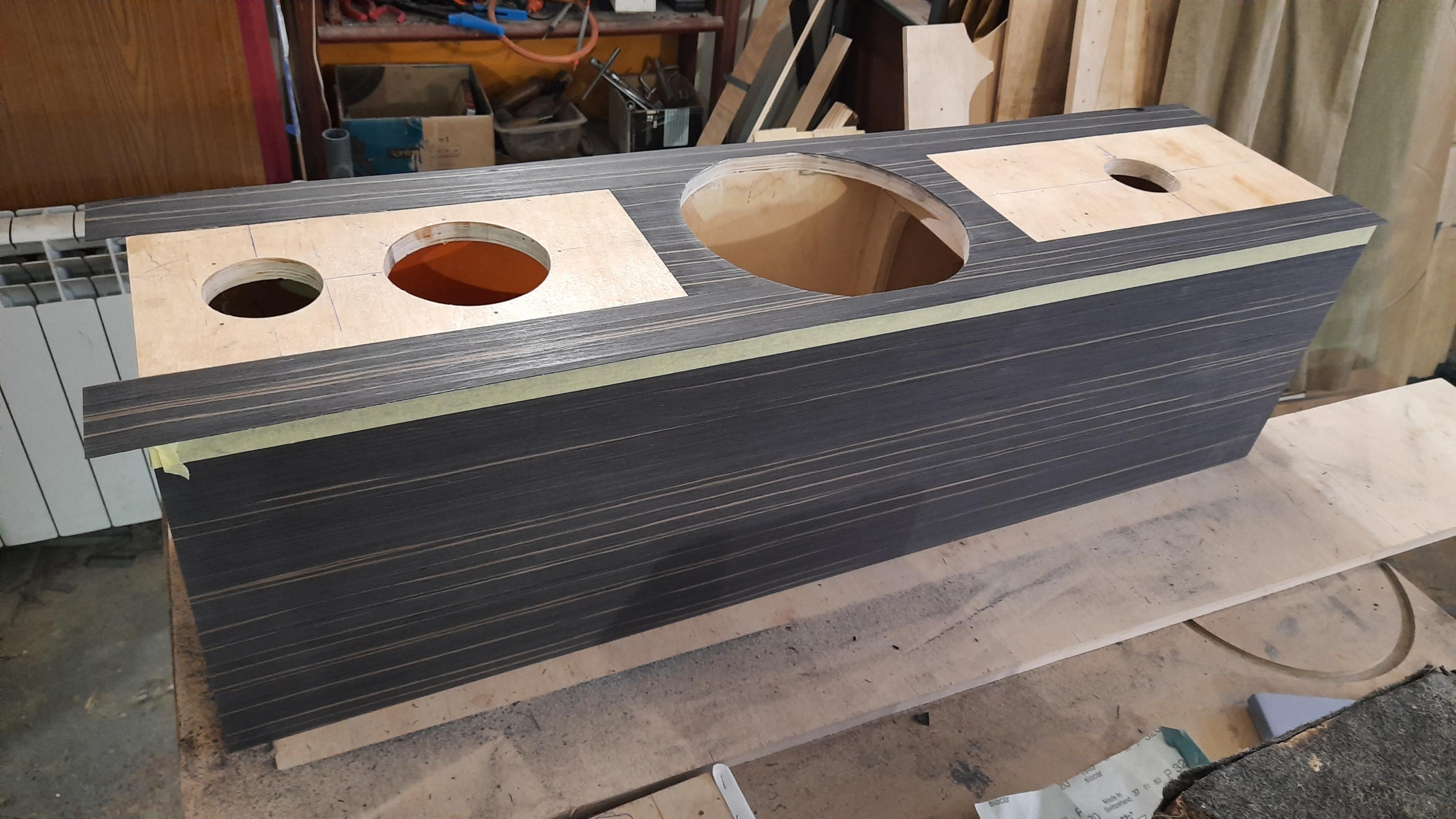 Отделка шпоном, шлифовка и покрытие корпусов завершены...получилось аккуратно и гармонично. Заодно отработали и улучшили качество отделки корпусов. Изготавливаем пасс кроссы для СЧ /ВЧ блока, ожидаем головки и продолжаем монтаж АС...