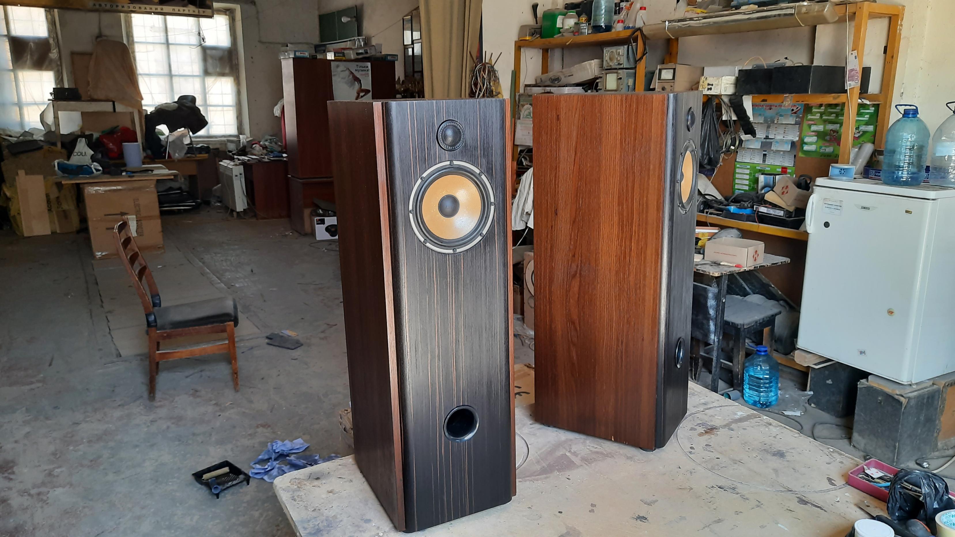 Покрыта шпоном и отшлифована вторая пара АС ( WHD+ Canton), передние накладные панели установлены и закреплены. Все готово к финишному покрытию....