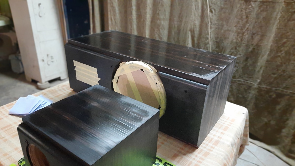 Завершаем проект… Все демонтируем из АС , изучаем красители и технологию для затемнения, удаляем масляную пленку. Наносим на образцы варианты тонировки, согласовываем с заказчиком и утверждаем, наносим тонировку на боковины, наносим покрытие маслом. Читается все просто, а процесс трудоемкий и требует аккуратности, тщательности. Наконец все подсохло, натираем, заказчик утверждает внешний вид( уже без жены))). Изюминка на торте…..шикарный шильдик- бонус от нас.Тщательно упаковываем для транспортировки и отгружаем заказчику. ( не близко от Днепра )