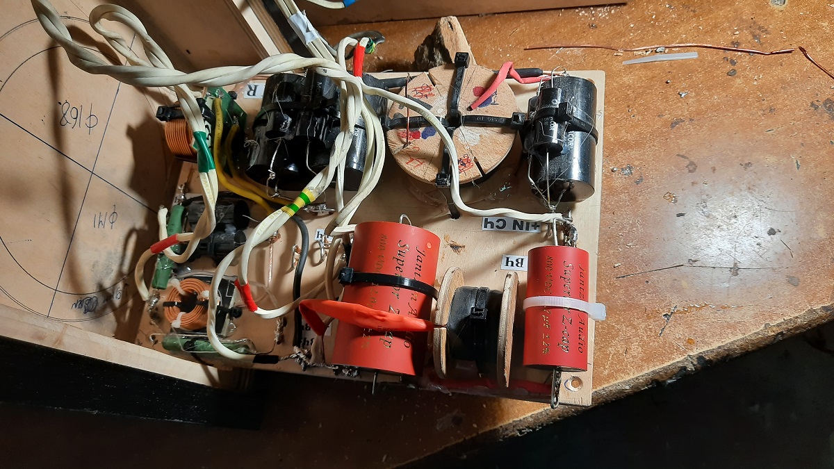 СЧ / ВЧ секция размещается в 15 л обьеме, чтобы акустически не поджимать снизу СЧ диапазон. На складе давно ожидал своего времени отличный топовый шелковый твиттер Seas Millenium и вот оно пришло. Заказчик очень любит и знает классическую иузыку ( ранее периодически посещал Вену слушать в оригинале ) , джаз ,ну и старый добрый рок.Среднечастотники : практически всегда в 3х полосках применяли 5-ти дюймовые головки, но в этом проекте решили применить 6,5 дюймовые. В наличии оказались интересные динамики из другого проекта и была возможность прослушать их .В корпусах без отделки установили динамики ( заодно сравнили шелковые Seas Millenium c бериллиевыми SB Acoustic ), с помощью процессора и поканалки отстроились,выбрали наилучший вариант фильтров, частот раздела и др., Рассчитали номиналы компонентов пасс кроссов, собрали их предварительно на элементах Monacor.Подстроились, прослушали…. Дуже чудово, очень интересные тембры привнес СЧ динамик, ну и с учетом вкуса заказчика остановились на шелковых ВЧ.