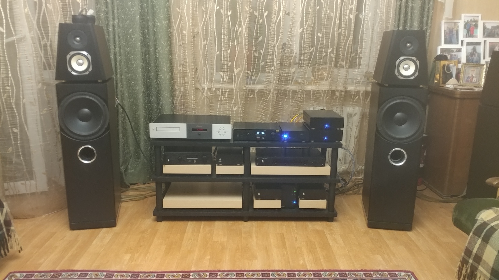 ИТак, место расположения АС выбрано...у окна, как на фото. В этом положении баса немного меньше, чем при расположении у телевизора. Но его достаточно и более ровный спектральный баланс.... Дополнительно решил еще раз сравнить звучание усилителей D-Class и Сlasse CAP-151 . Акустические кабели, межблочники, сетевые.. одни и те же, в качестве источника - Classe CDP-1, а в качестве АС использовались 3-х полосные с пасс кроссами AC Tower ( на базе ScanSpeak и Fostex ) ... Прослушивание продолжается....