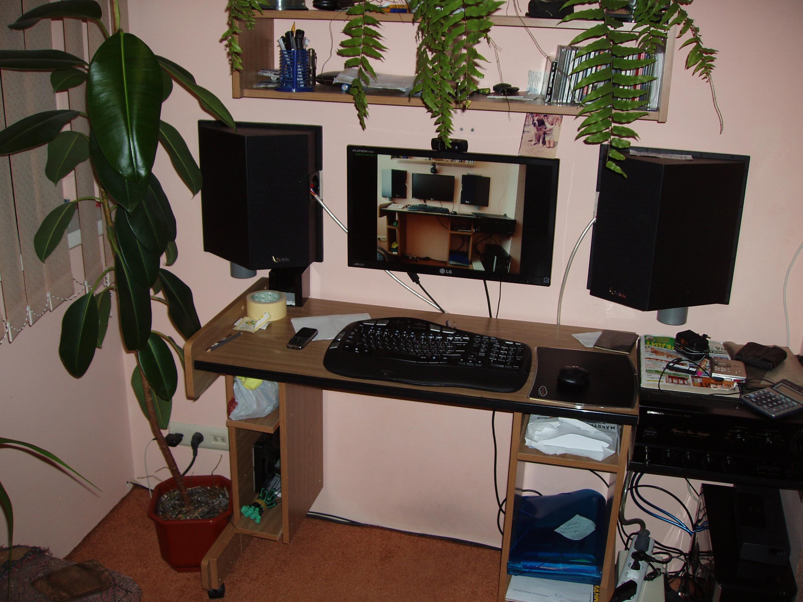 Отлично изготовления система! И выглядит дорого. Но не слишком ли узковата стереобаза? Может быть с этой целью лучше изготовить две отдельные колонки? Тогда и ногу монитора менять не пришлось бы... Если я правильно понял, система установлена дома. Попрошу-ка одного нашего одноклубника выставить свою домашнюю/ компьютерную систему, которая звучит просто шикарно да и выглядит необычно