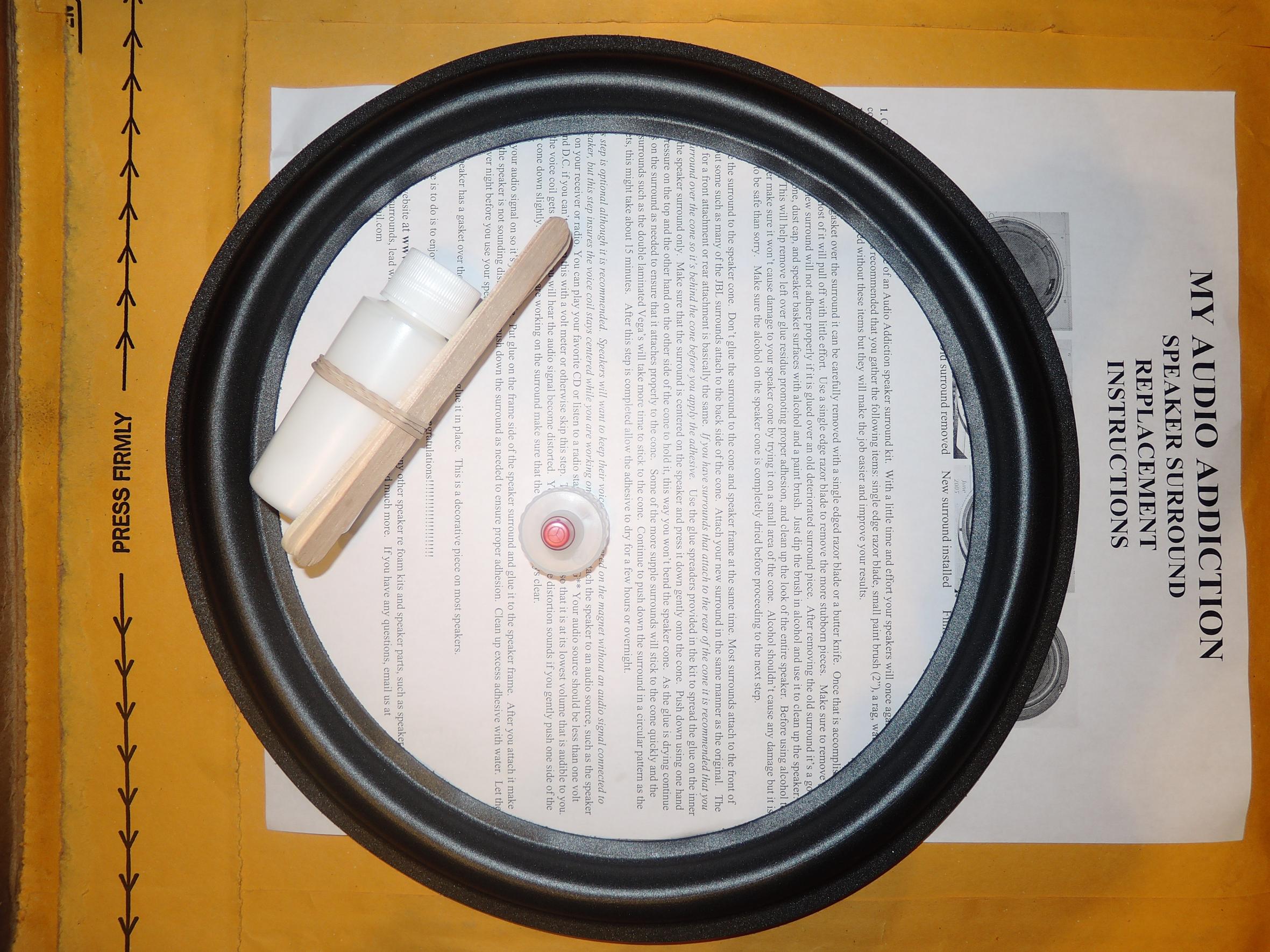 полный комплект для ремонта сабвуфера Dynaudio MW190: вспененный подвес, тюбик клея, инструкция, нос для нанесения клея. Ценник $22.