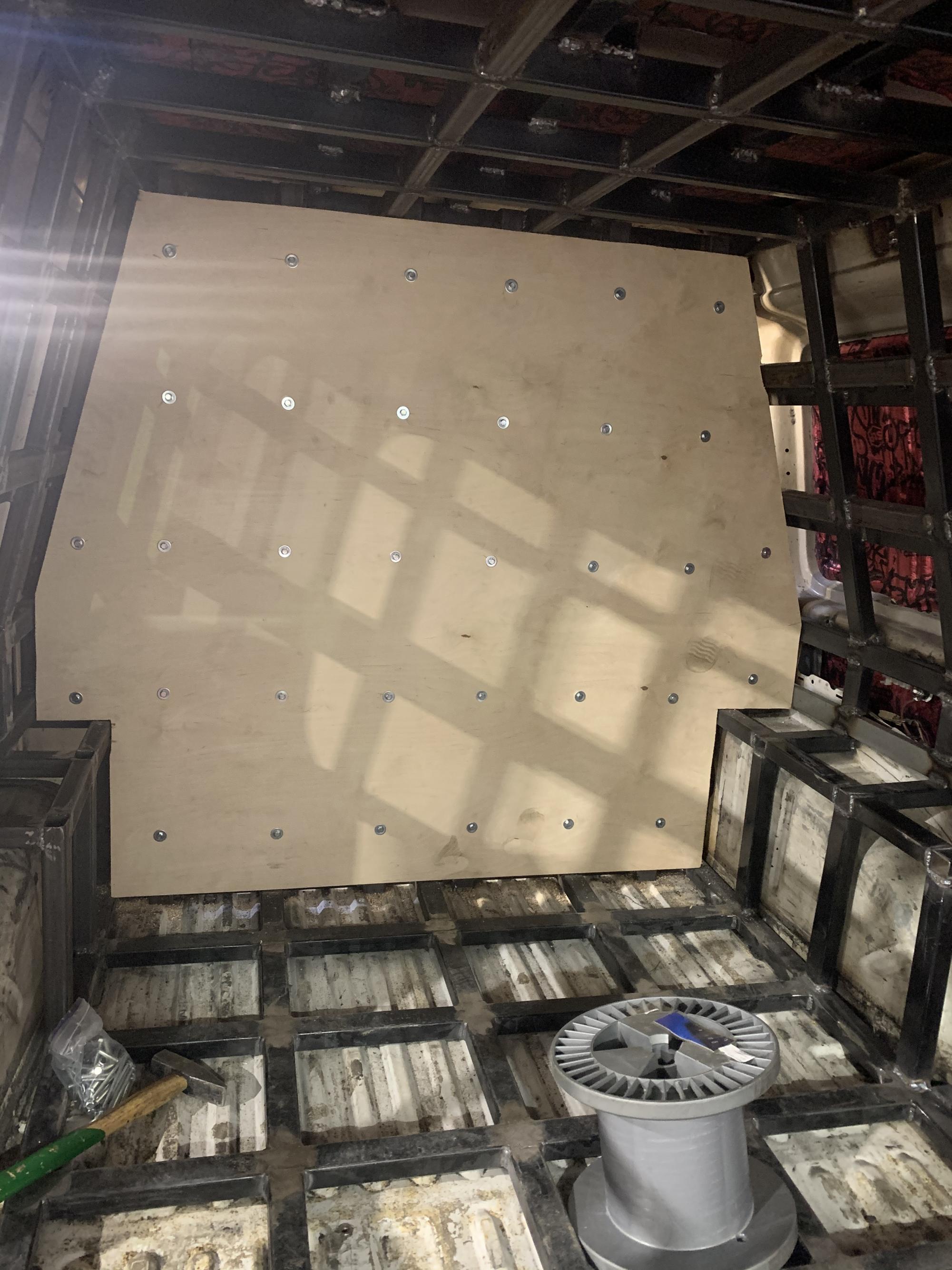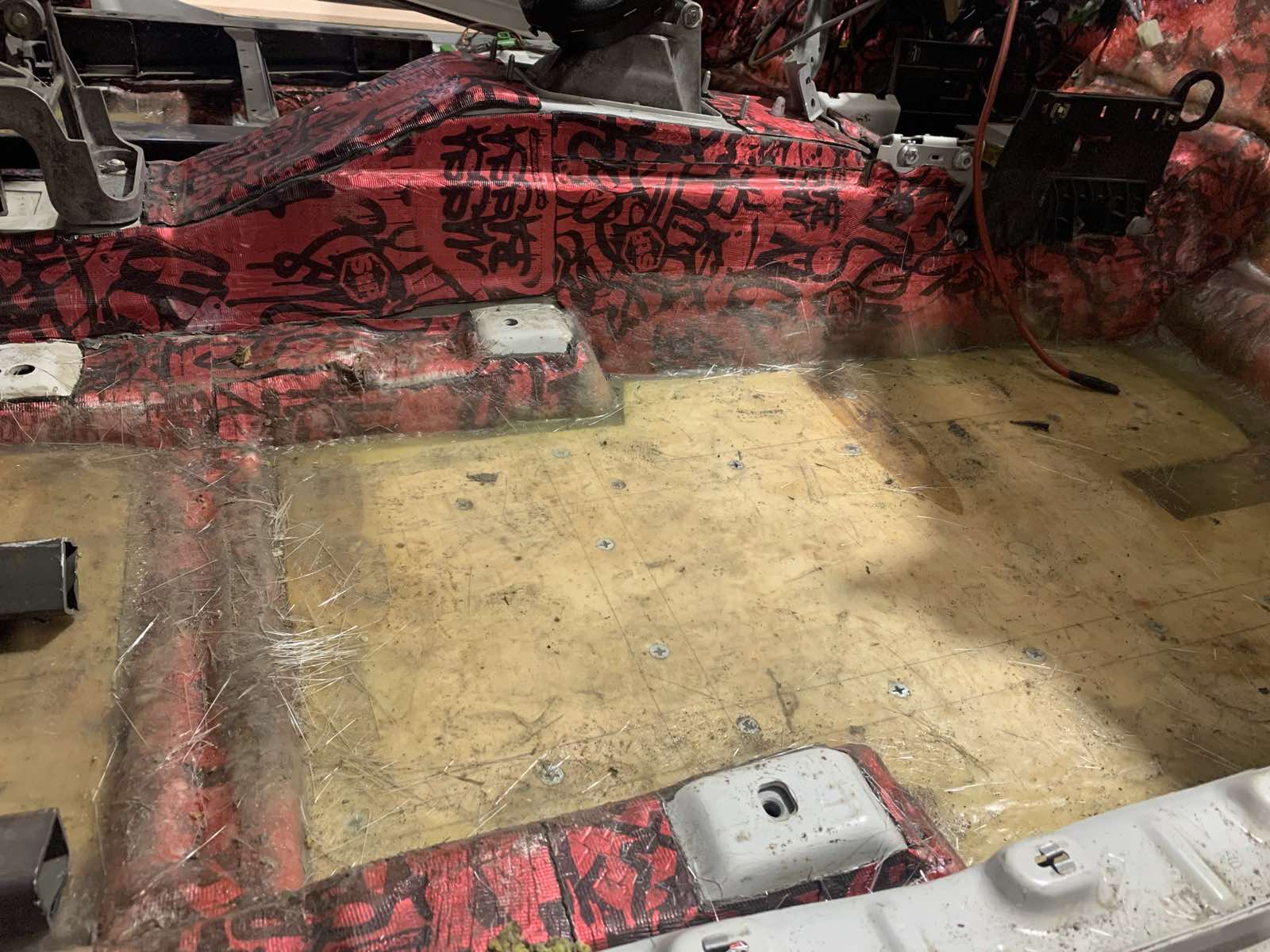 Порт - будет находиться за водителем, одной из самой вибронагруженной части будет правая передняя четверть и в частности пол. Поэтому - не без лёгких путей, делаем каркас на полу раму, скватываясь в контрольных точках. Далее все полости заливаем смолой с крошкой и немного секретной рецептуры, для максимальной жескости и исключения всех воздушных полостей. Далее всё это накрываем 24 фанерой и всё тщательно связываем при этом проливая все щели и стыки. После получаем эффект "мраморной плиты" стучим, а оно как "горохом об стену" ....