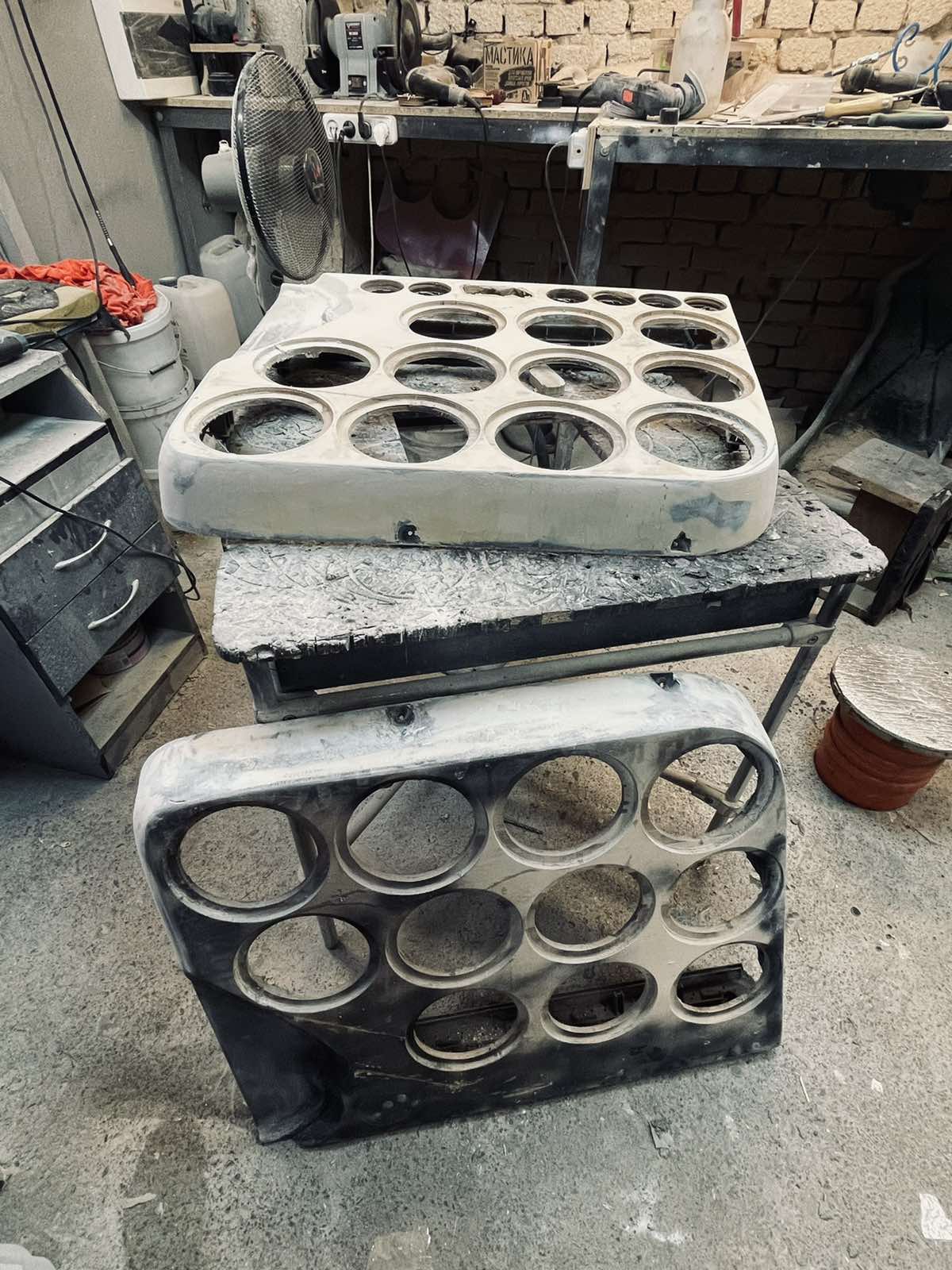 Следующий этап, собрать до конца камеру, стенку на которую будут крепиться сабвуферы, потом покрыть это всё смолой, сделать титанический труд что бы его вышкурить, загрунтовать (в закрытом помещении) и покрасить.... это было действительно сложно....