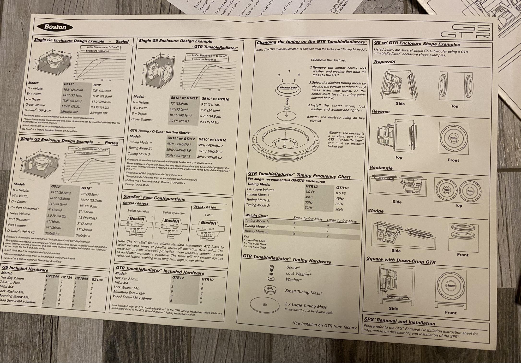 Отличный саб с хорошей тоналкой, давкой, и скоростью, разборная конструкция, то есть диффузор можно просто открутить вместе с катушкой и центрирующей шайбой не нарушая центровки. Замечательная система охлаждения, высокая надежность - по отзывам до кВт мощности без последствий. Интересней В комплекте пассивный излучатель Boston Acoustics GTR который имеет три варианта настройки, даёт прирост как ФИ только в 30л. объема без пердежа и потери скорости. Под академ жанры можно изготовить заглушку и под настроение снимать ПИ делая ЗЯ Все новое в коробках с мануалами, 2006-2007 года выпуска, не подключалось ни разу!!! Если вы хотите знать, каким должен быть сабвуфер, познакомьтесь с Boston G5. Обновление модельного ряда автомобильных сабвуферов фирмы Boston Acoustics дошло до топовой линейки. Компания выпускает на рынок новую серию Boston G5, в которой нашли отражение самые современные тенденции и технологии индустрии. В конструкции сабвуферов Boston G5 применен традиционный для компании жесткий кополимерный диффузор, приводимый в движение звуковой катушкой диаметром 2,75 дюйма. Один взгляд на магнитную систему внушает уважение: сборка из ферритовых магнитов двойной толщины недвусмысленно намекает на огромный ход подвижной системы. Эти подозрения подкрепляются крупным гофром из вспененной резины (обычная резина для длинноходных головок непригодна в связи с возможной потерей устойчивости и последующим за этим снижением громкости). Линейный ход диффузора составляет 15 мм, а максимальный – 45 мм! Обратите внимание, что для новых Boston G5 предусмотрены такие же объемы акустического оформления, как и для младшей линейки Boston G2. Если вам стало не хватать баса, воспроизводимого “младшеньким” G2, вы можете установить в тот же корпус более мощный G5. Если же вам и этого покажется мало, можно, опять же не изменяя корпуса, установить в него настраиваемый пассивный радиатор GTR, который позволит увеличить отдачу еще на 3 дБ на самых низких частотах! Система эффективного охлаждения звуковой катушки - Radial VentВ® Sure Set™ - удобная система коммутации/защиты катушек при помощи перемычек-предохранителей Конструкция Soft Part System (SPS™) позволяет, в случае необходимости заменять сгоревший сабвуфер Оптимизированы для работы в малом объеме - 1 куб. фут (28 л) Долговременная мощность RMS 450 Вт Частотная характеристика 20 - 350 Гц (± 3 дБ) Сопротивление звуковой катушки 4 Ом Уровень звукового давления 86,8 (дБ на 1Вт/1м) дБ Чувствительность 90,6 (дБ на 2,83В) Эквивалентный объем (Vas) 74,53 л Механическая добротность (Qms) 9,94 Полная добротность (Qts) 0,58 Линейное перемещение, одностороннее [(Hvc-Hag)/2] Xmax 15,3 мм Максимальное механическое перемещение (от пика до пика) (Xmax) 45 мм Электрическая добротность (Qes) 0,62 Площадь диффузора (Sd) 499 см2 Активное сопротивление обмотки (Re) 3.3 Ом Масса подвижной системы (Mms) 135,8 г Гибкость подвижной системы (Сms) 213 Силовой фактор (Bl) 11,72 Тлм Рекомендуемый объем фазоинверторного корпуса 56,6 л Диаметр фазоинверторного порта 100 мм Длина фазоинверторного порта 360 мм Частота настройки 33 Гц Рекомендуемая установка регулятора Q-Tune уcилителя Boston GT 33Гц @ 1,0 Рекомендуемый объем закрытого ящика 28,3 л Рекомендуемая установка регулятора Q-Tune уcилителя Boston GT 28Гц @ 0,7 Размер динамика 12" Звуковая катушка 2 3/4", 4-слойная Магнитная система Cборка из ферритовых магнитов двойной толщины Диффузор Кополимерный Монтажная глубина 187 мм Монт