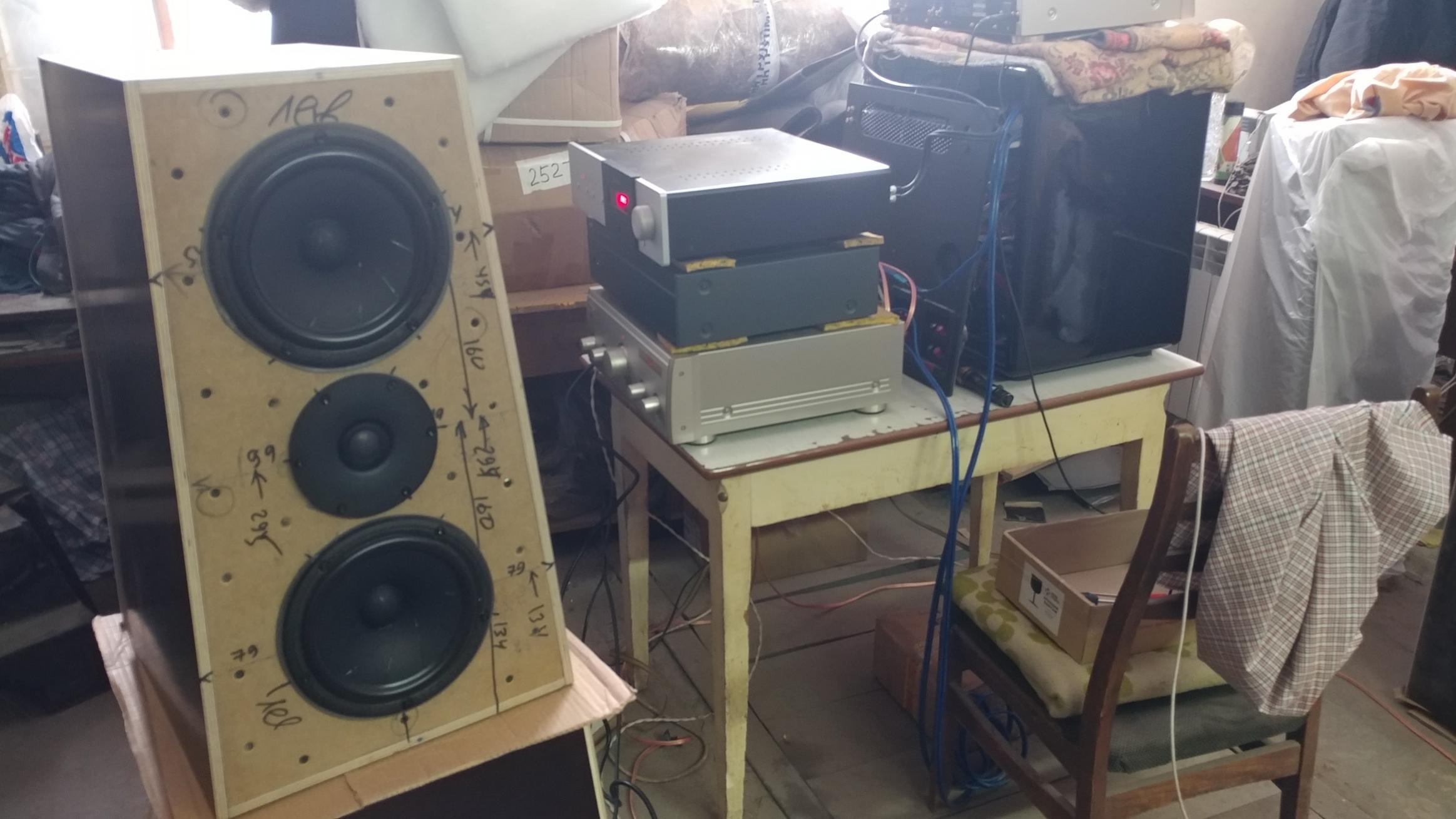 На мой взгляд СЧ и ВЧ диапазоны лучше звучат... Все таки на НЧ усь требуется и помощнее и более согласоваанный с головкой... Вцелом звучание очень хорошее, заказчик бегло прослушал....замечаний никаких не высказал, а так...небольшое одобрение. Внешний вид , очертания и качество подготовки к финишной отделке ...понравились...произвели хорошее впечатление.