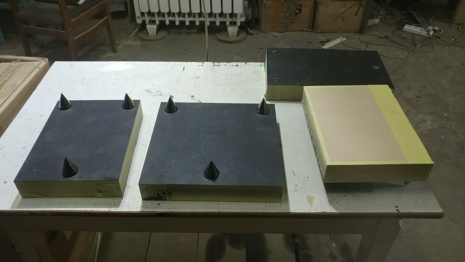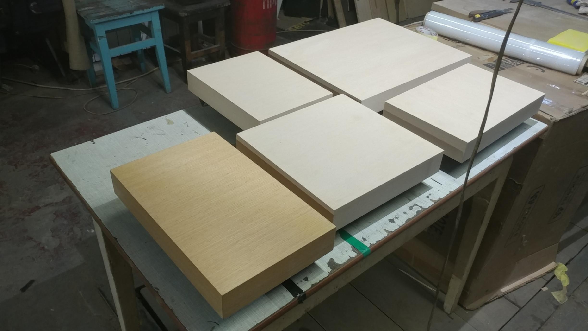 Так как отделка комнаты для прослушивания у заказчика завершается, решили, имея уже собственный опыт прослушивания, провести модернизацию аппаратной стойки клиента. Теперь , как и у меня , несущие панели будут жестко связаны между собой металлическими опорами со шпильками диаметром 6мм. А непосредственно на несущих панелях уже будут расположены с развязкой через конусы опорные плиты из МДФ 50мм с блоками аппаратуры. Итак, опорные плиты уже изготовлены под каждый аппаратный блок, покрыты светлым шпоном , а далее многослойное декоративное и защитное покрытие маслом.