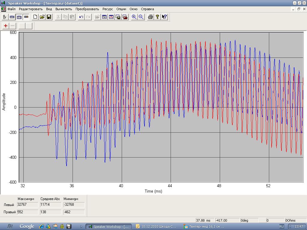 Вау! Да тут уже и результирующая ближе к исходному сигналу. И по форме и по частоте и по амплитуде. Не идеальна, но похожа. Ничего не поделаешь- ближние переотражения в реальном автомобиле портят форму исходных сигналов как мида так и твитера. Это видно на первом графике из этой пары. Как видим, " Линейка" ошиблась на 5 см, результат этой ошибки " на лицо". Хотя, в данном случае это не важно. Я мог и ошибится в правильности измерения "аккустического центра". В реальной машине это тяжело. В этих измерениях важнее сам факт закономерностей между первым графиком и вторым. Пока что интересно. Смещение на 5 см ( 1.5 милисекунды) одного динамика относительно другого приводит к очень заметным результатам на сумарном сигнале. Можно быть глухим ( к примеру , ярым дайвером), и не услышать разницу в звуке, но она очень хорошо видна. Последний раз редактировалось Куряка; 03.05.2011 в 11:21. |