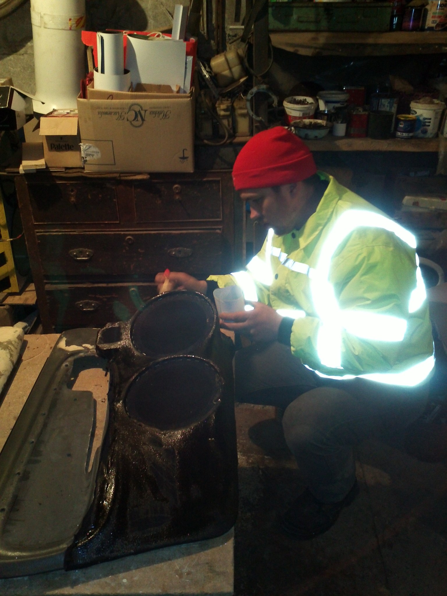 далее всё как обычно: колготы ( в моём случае футболки), смола+ стекломат. короче первый слой готофф — сохнет. наша цель толщина миллиметров 5-7))))).