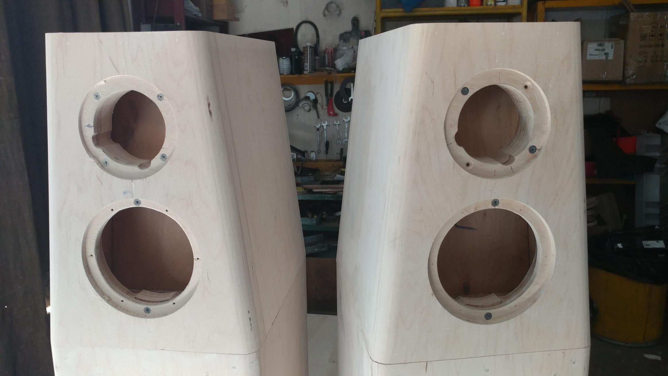 Ну и начали ЕЩЕ один новый, очень интересный проект напольной 3-х полосной акустики: оригинальная и технологичная по сборке и изготовлению конструкция, очень симпатичный дизайн... Материал - 21мм фанера, финишная отделка - натуральный итальянский шпон 2 цветов, с покраской отдельный деталей ... Все заготовки уже подготовлены,заодно освоили наклонные распиловки на циркулярке с хорошей точностью... Головки тоже определены и приобретены...Вперед...