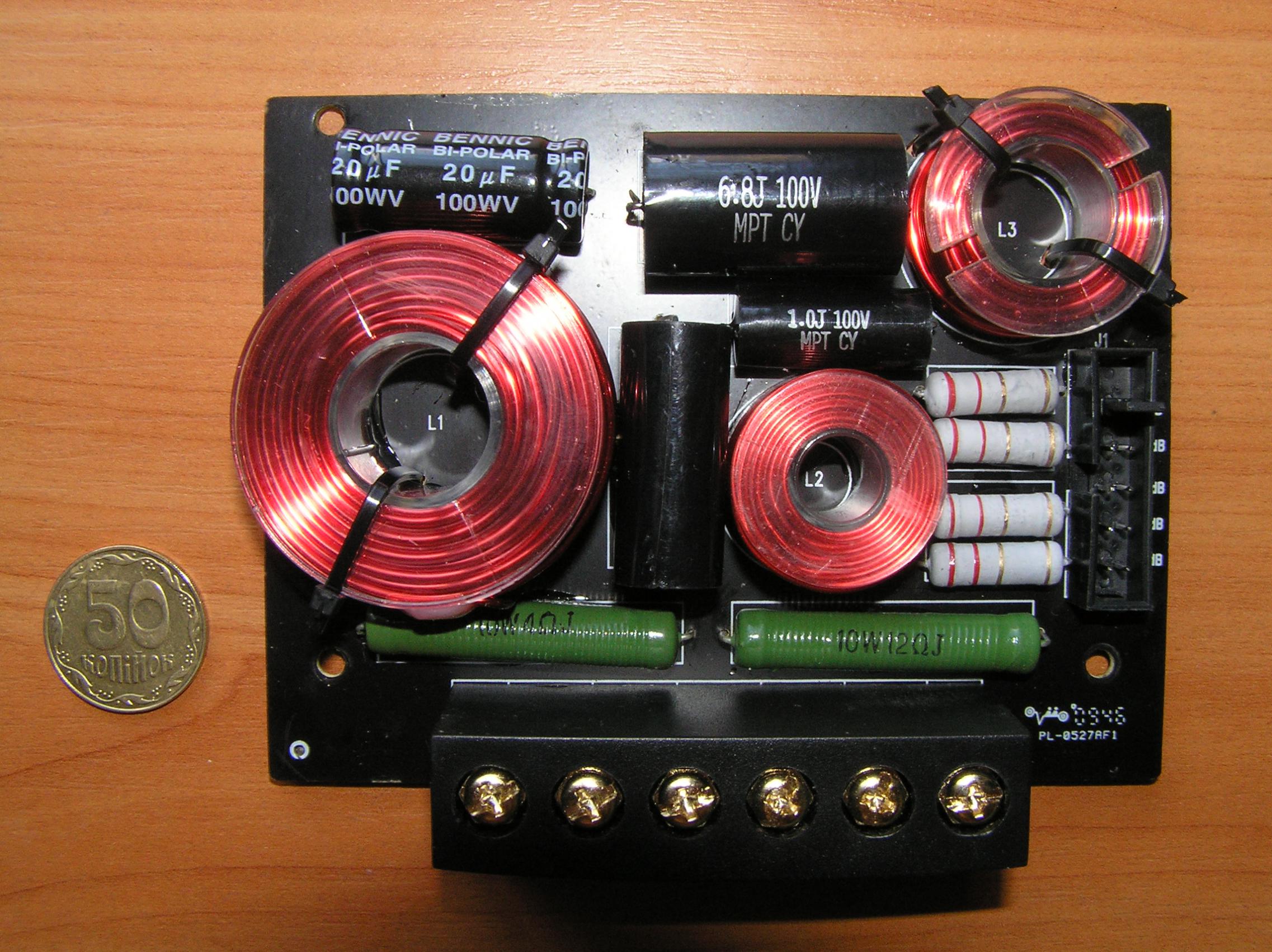 - Кроссовер построен на базе высококачественных компонентов: пленочные конденсаторы, низкоиндуктивные металлопленочные резисторы, катушки индуктивности с воздушным сердечником, и увеличенным сечением медных проводников.