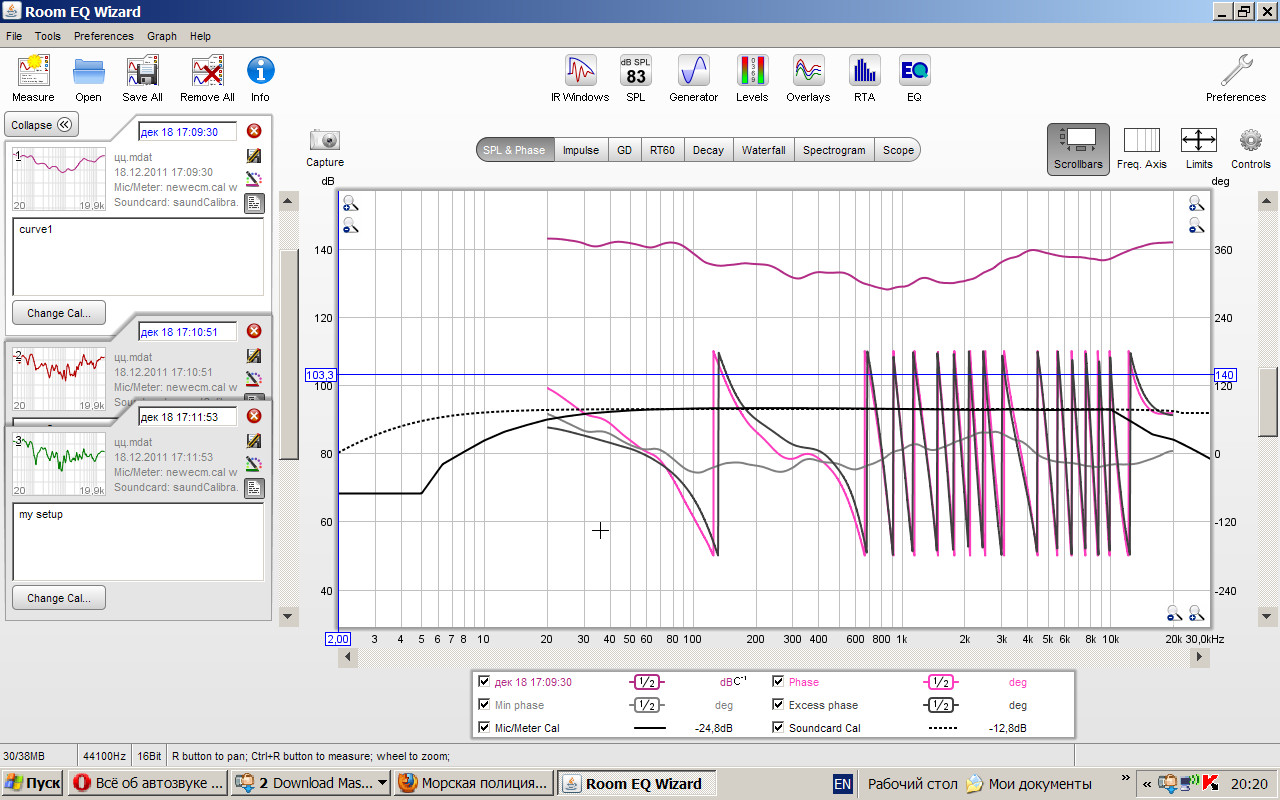 Левый мид , провал на АЧХ , перепад на графике мин. фазы . Поперечный резонанс , устранить можно только установкой мида в другое место , а лучше и в другое авто ![]() Тот же дефект на графике ГВЗ - стрелочка номер два , а вот стрелочка первая еще резонанс , угадайте какой . Следующие три картинки АЧХ , мин. фаза и ГВЗ . Левый канал желтая , правый розовая , кривульки. Ну АЧХ с таким разрешением страшненькая , но хорошо видно "гребенку"(интерференцию) на СЧ и ВЧ . На этом графике можно наблюдать соответствующие изменения минимальной фазы . График ГВЗ наводит на мысли о бренности всего сущего ... А вот фаза левый ... ...фаза правый каналы , ну не так уж точно сведенные , но ... Если представлять , на каких частотах резкие перепады фазы соответствуют дефектам ФЧХ самих динамиков , то можно ловить блох по сопряжению полос . Видно явное отличие левого канала от правого , особенно выше 2 кгц . |